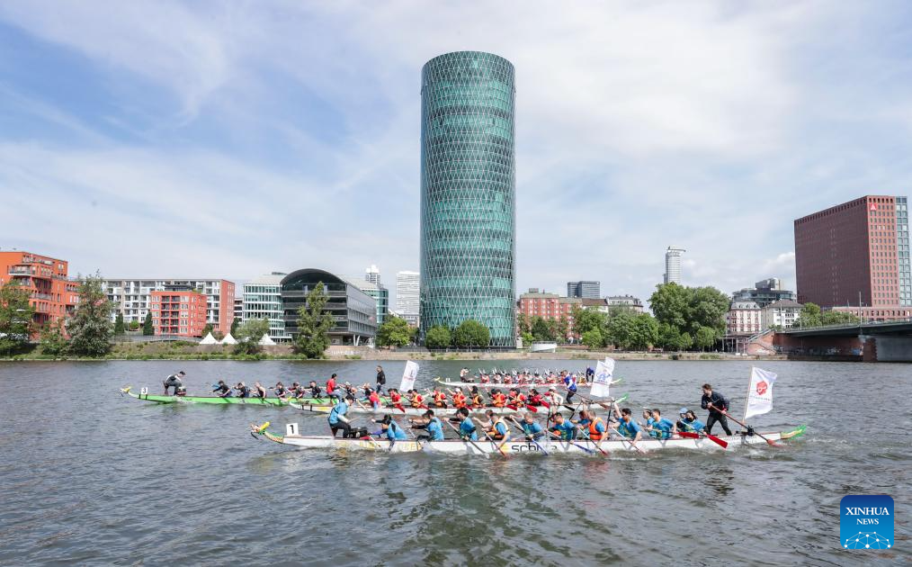 Dragon boat teams compete on the Main River during the 1st Frankfurt Dragonboat Festival in Frankfurt, Germany, May 24, 2025. (Xinhua/Zhang Fan)