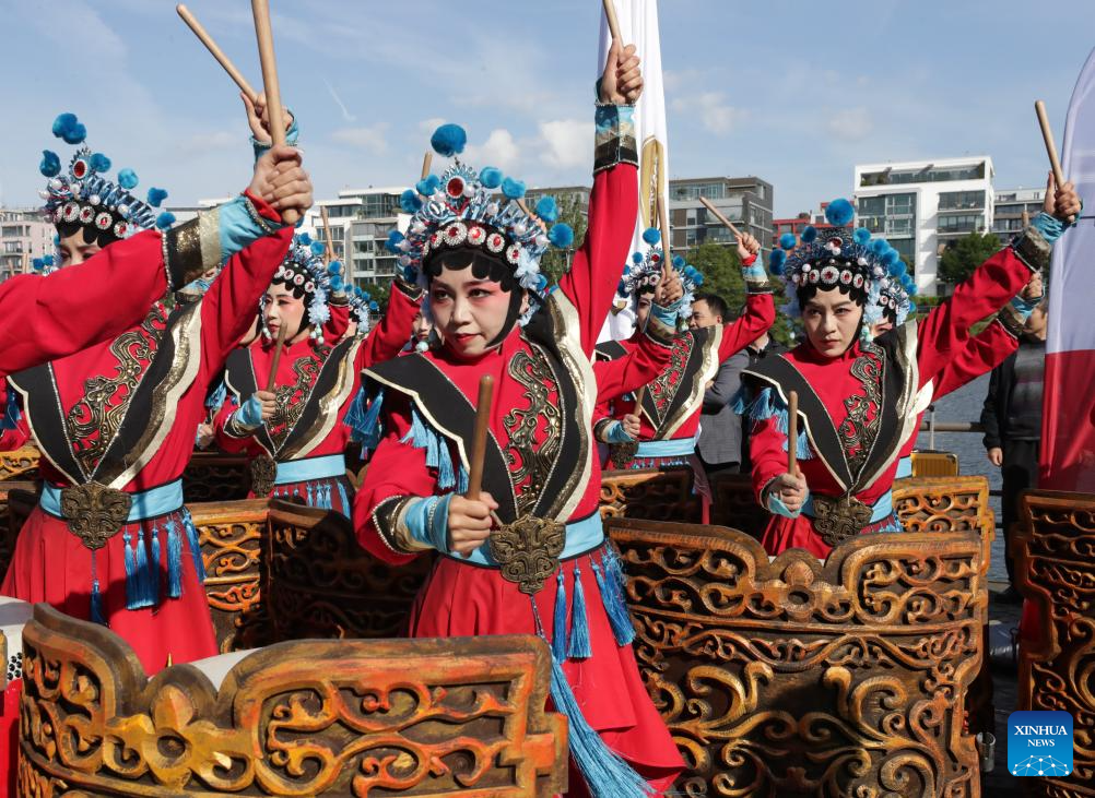 Artists perform traditional Chinese war drums during the 1st Frankfurt Dragonboat Festival in Frankfurt, Germany, May 24, 2025. (Xinhua/Zhang Fan)