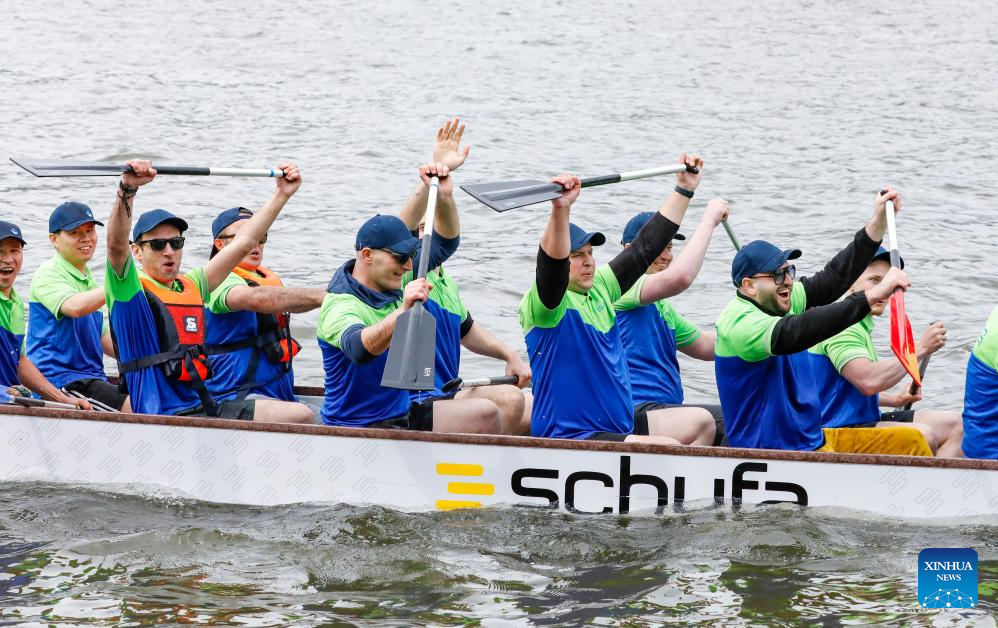 Members of a dragon boat team cheer after the competition on the Main River during the 1st Frankfurt Dragonboat Festival in Frankfurt, Germany, May 24, 2025. (Xinhua/Zhang Fan)