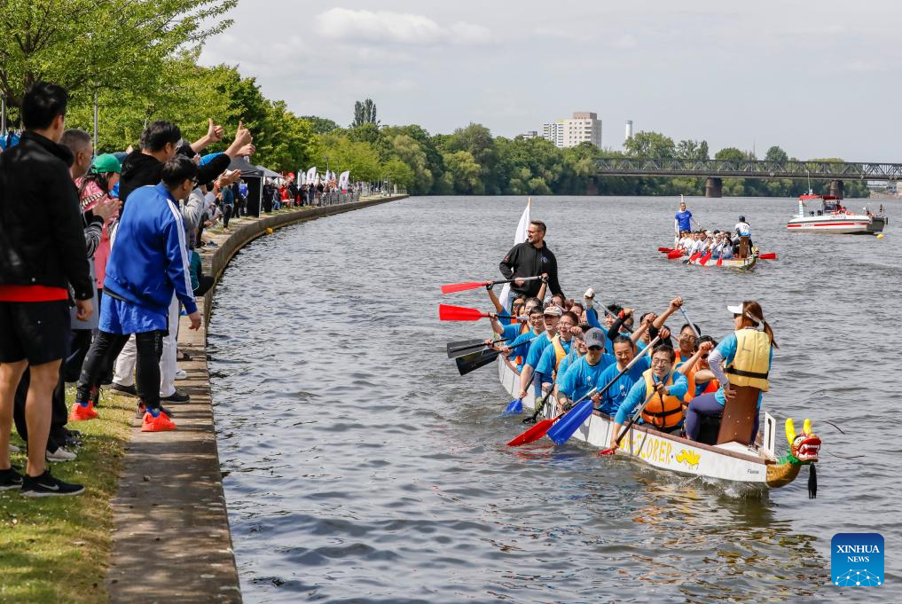 Dragon boats compete on Main River in Frankfurt, Germany, May 25, 2024. (Xinhua/Zhang Fan)