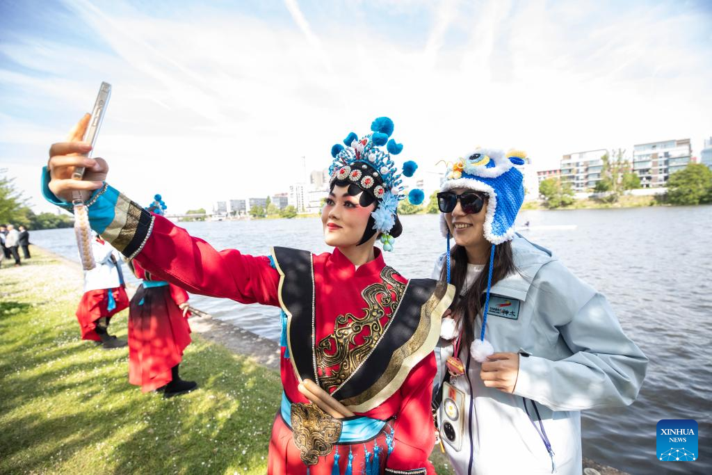 An artist takes a selfie with a spectator during the 1st Frankfurt Dragonboat Festival in Frankfurt, Germany, May 24, 2025. (Xinhua/Zhang Fan)