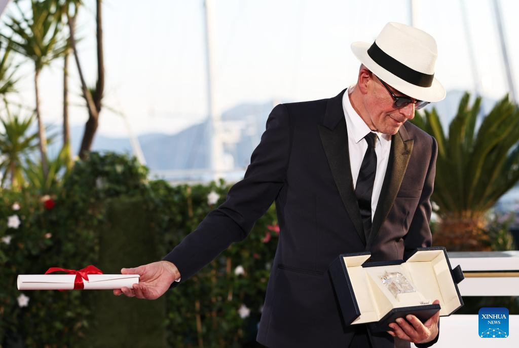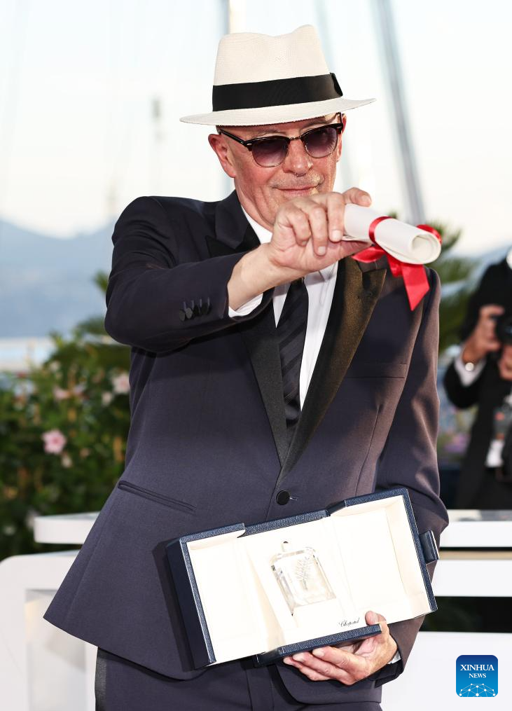 French director Jacques Audiard poses after winning the Jury Prize for the film "Emilia Perez" during the Closing Ceremony at the 77th edition of the Cannes Film Festival in Cannes, southern France, on May 25, 2024. (Xinhua/Gao Jing)