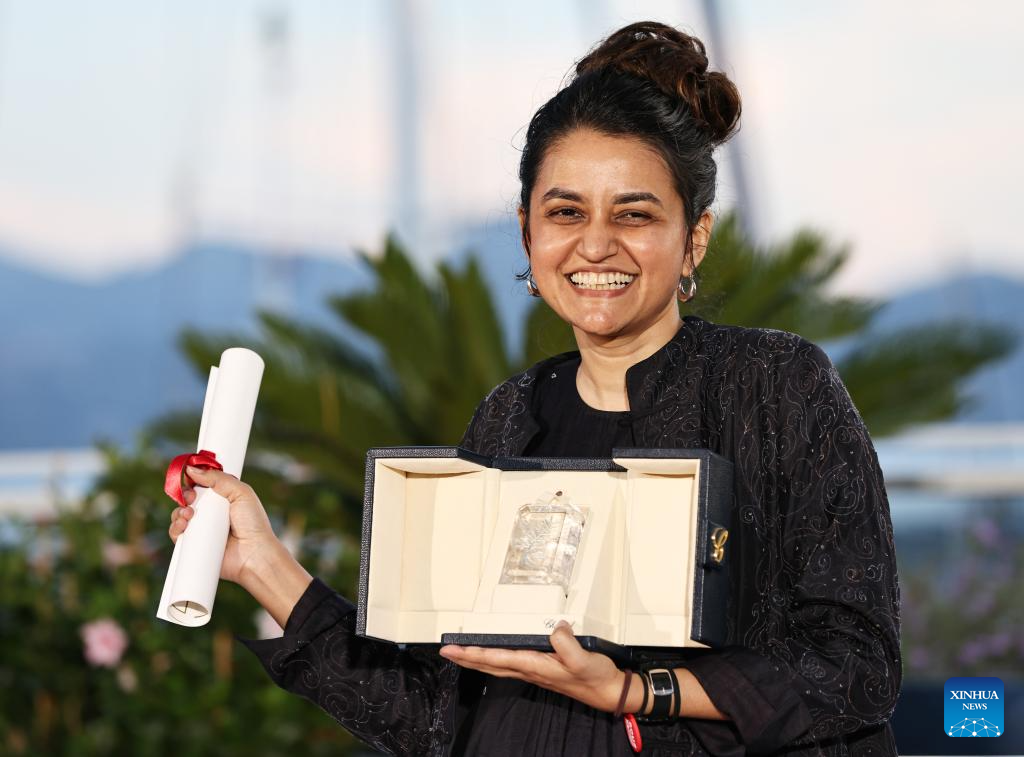 Indian director Payal Kapadia poses after she won the Grand Prix for the film "All We Imagine as Light" during the Closing Ceremony at the 77th edition of the Cannes Film Festival in Cannes, southern France, on May 25, 2024. (Xinhua/Gao Jing)