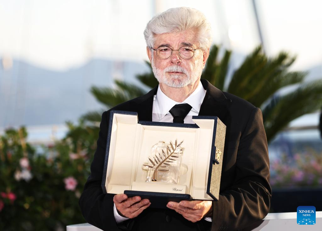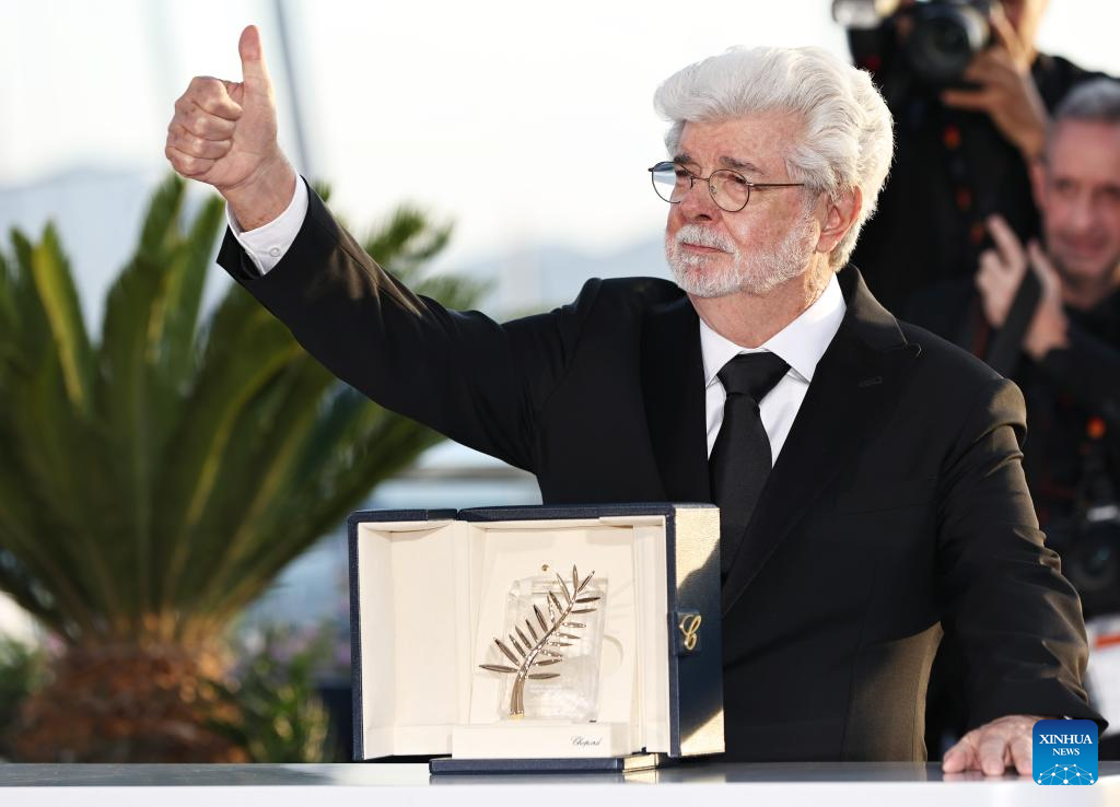 U.S. director George Lucas poses with his Honorary Palme d'Or during the Closing Ceremony at the 77th edition of the Cannes Film Festival in Cannes, southern France, on May 25, 2024. (Xinhua/Gao Jing)