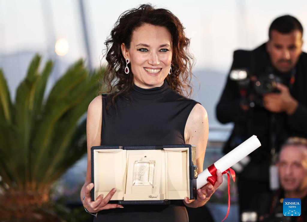 French director Coralie Fargeat poses after she won the Best Screenplay prize for the film "The Substance" during the Closing Ceremony at the 77th edition of the Cannes Film Festival in Cannes, southern France, on May 25, 2024. (Xinhua/Gao Jing)