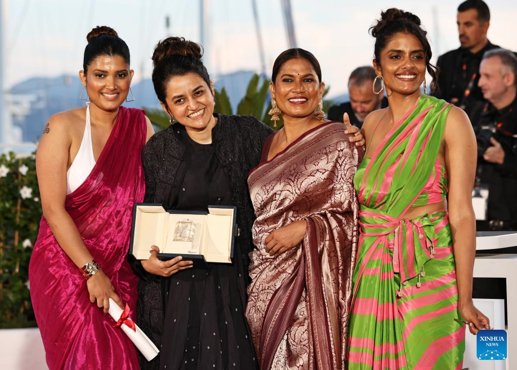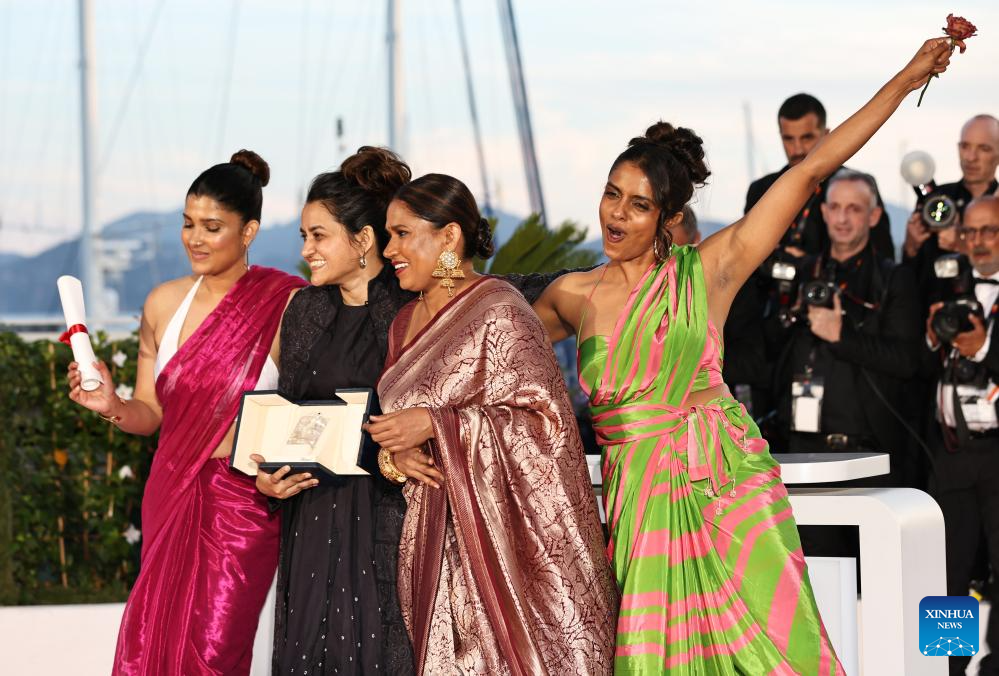 Indian director Payal Kapadia (2nd L) poses with cast members after she won the Grand Prix for the film "All We Imagine as Light" during the Closing Ceremony at the 77th edition of the Cannes Film Festival in Cannes, southern France, on May 25, 2024. (Xinhua/Gao Jing)