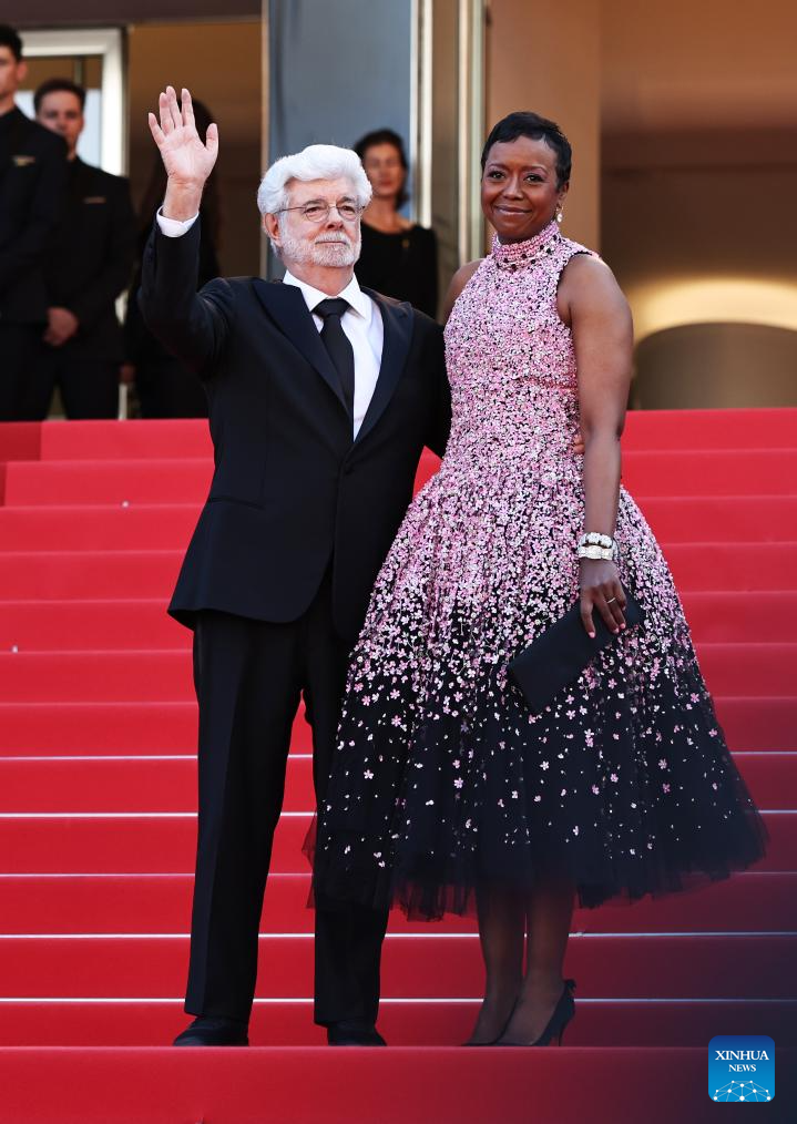 U.S. director George Lucas (R) arrives for the Closing Ceremony at the 77th edition of the Cannes Film Festival in Cannes, southern France, on May 25, 2024. (Xinhua/Gao Jing)