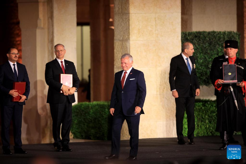 Jordan's King Abdullah II (C) attends a ceremony celebrating Jordan's Independence Day at Al Husseiniya Palace in Amman, Jordan, May 25, 2024. Jordan marked its 78th Independence Day on Saturday. (Photo by Mohammad Abu Ghosh/Xinhua)