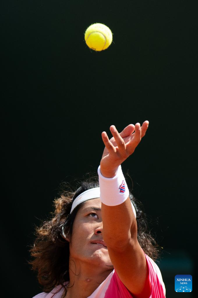 Zhang Zhizhen of China serves during the men's singles first round match between Zhang Zhizhen of China and Aleksandar Vukic of Australia at the French Open tennis tournament at Roland Garros, Paris, France, May 26, 2024. (Xinhua/Meng Dingbo)