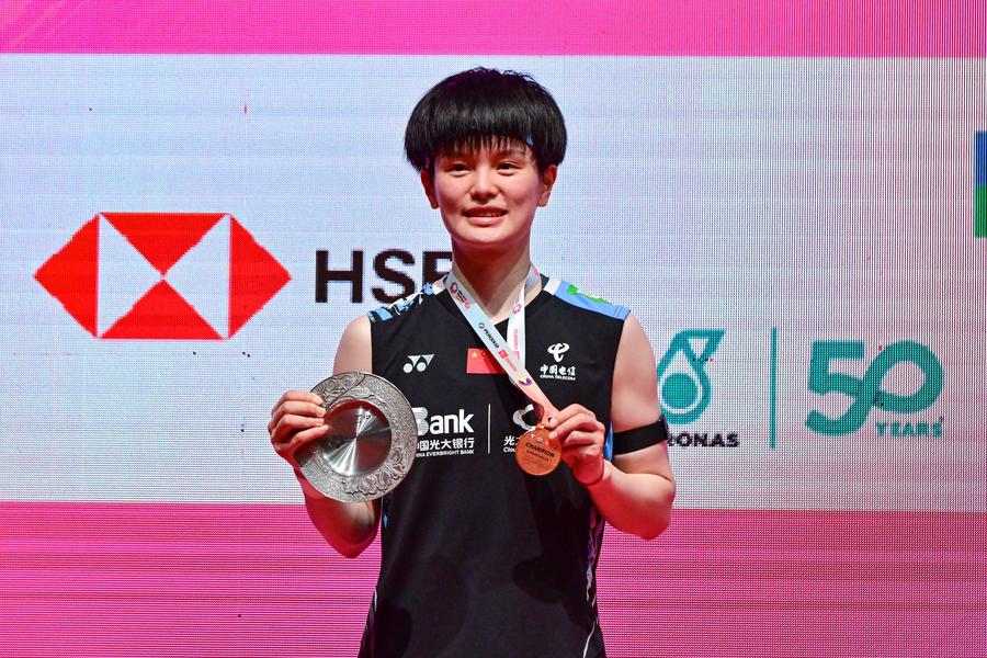 Wang Zhiyi of China poses for photos during the awarding ceremony after the women's singles final match between Wang Zhiyi of China and Venkata Sindhu Pusarla of India at Malaysia Masters 2024 in Kuala Lumpur, Malaysia, May. 26, 2024. (Photo by Chong Voon Chung/Xinhua)