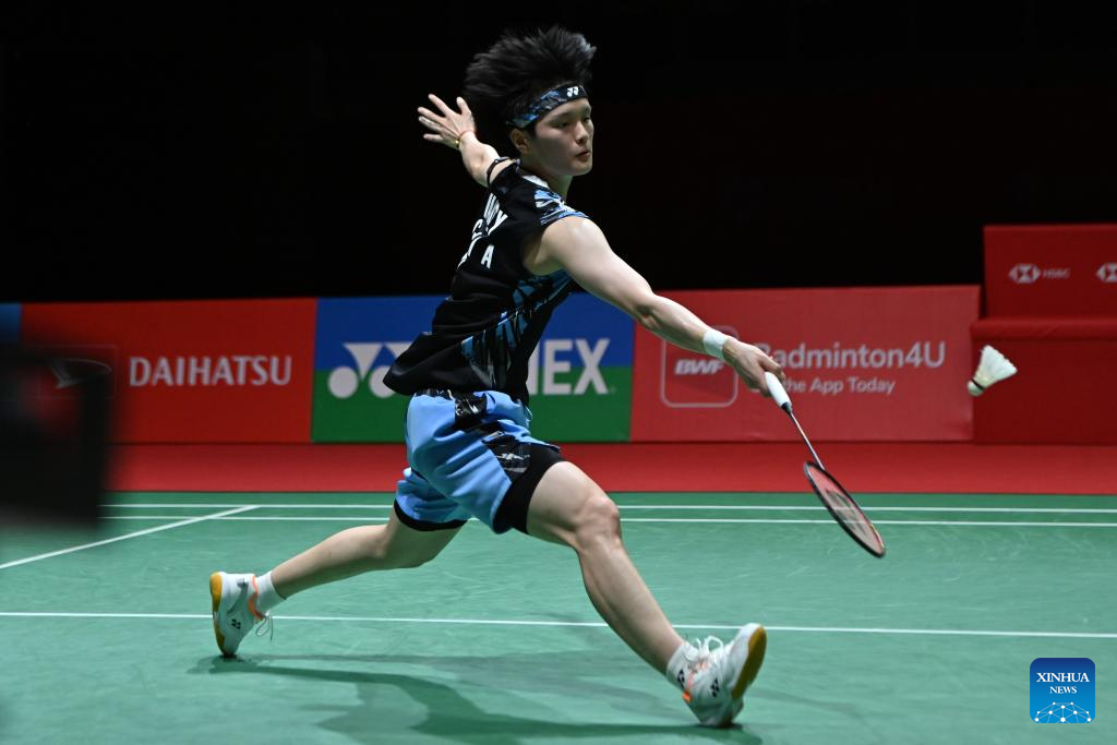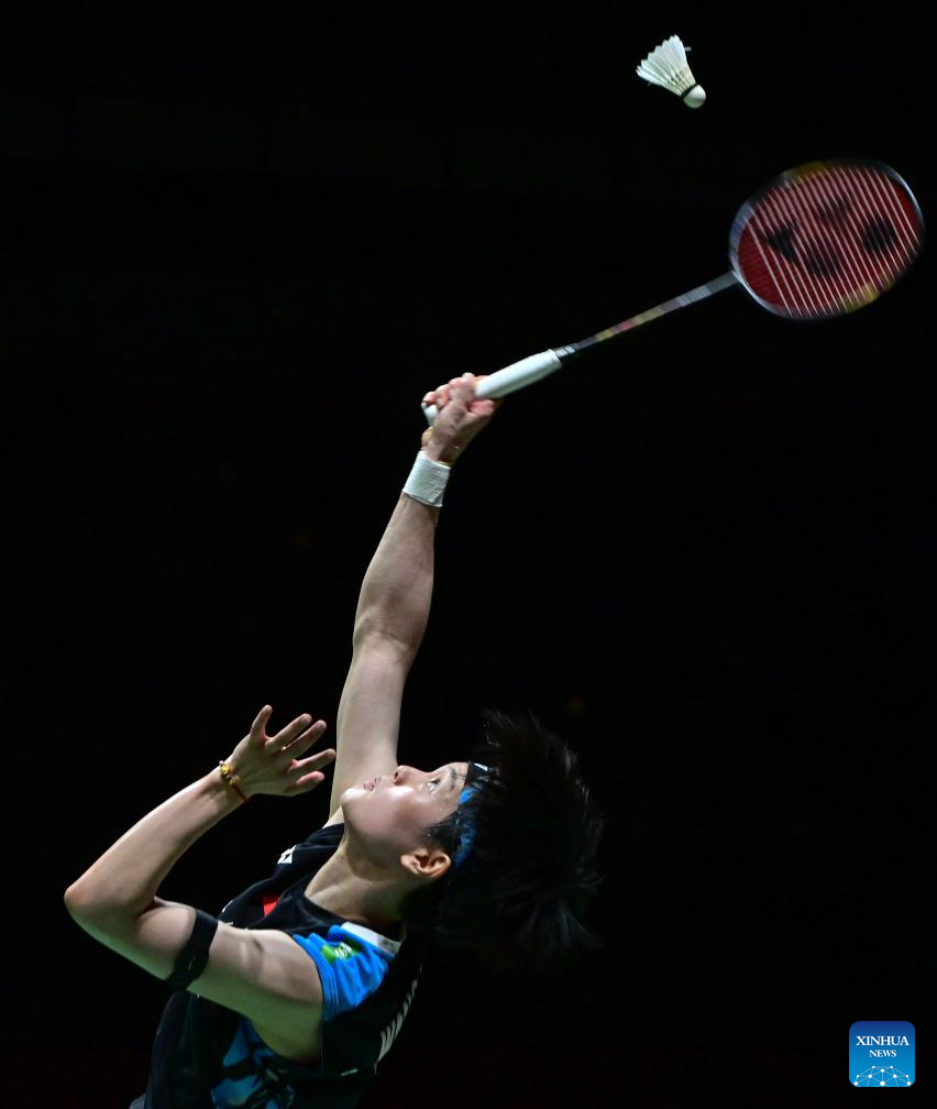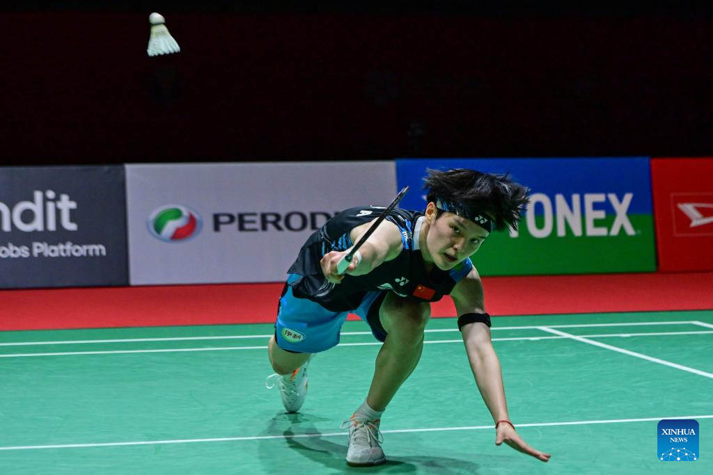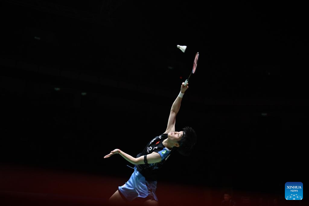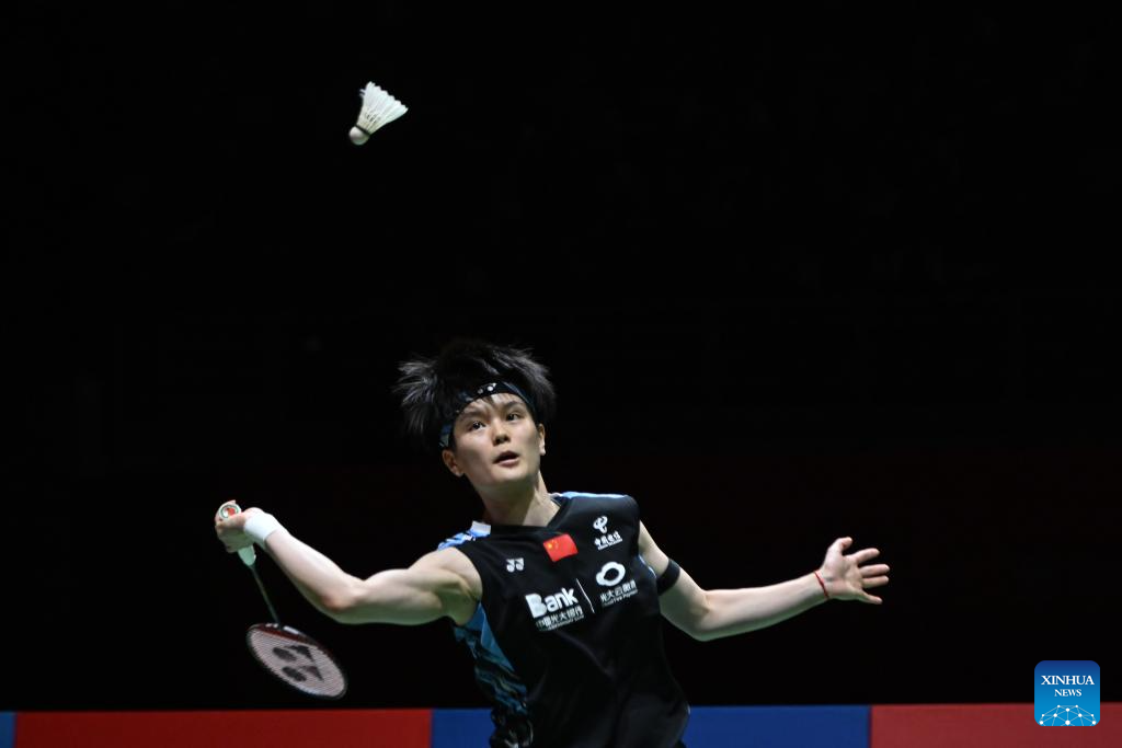 Wang Zhiyi of China hits a return during the women's singles final match between Wang Zhiyi of China and Venkata Sindhu Pusarla of India at Malaysia Masters 2024 in Kuala Lumpur, Malaysia, May. 26, 2024. (Photo by Chong Voon Chung/Xinhua)