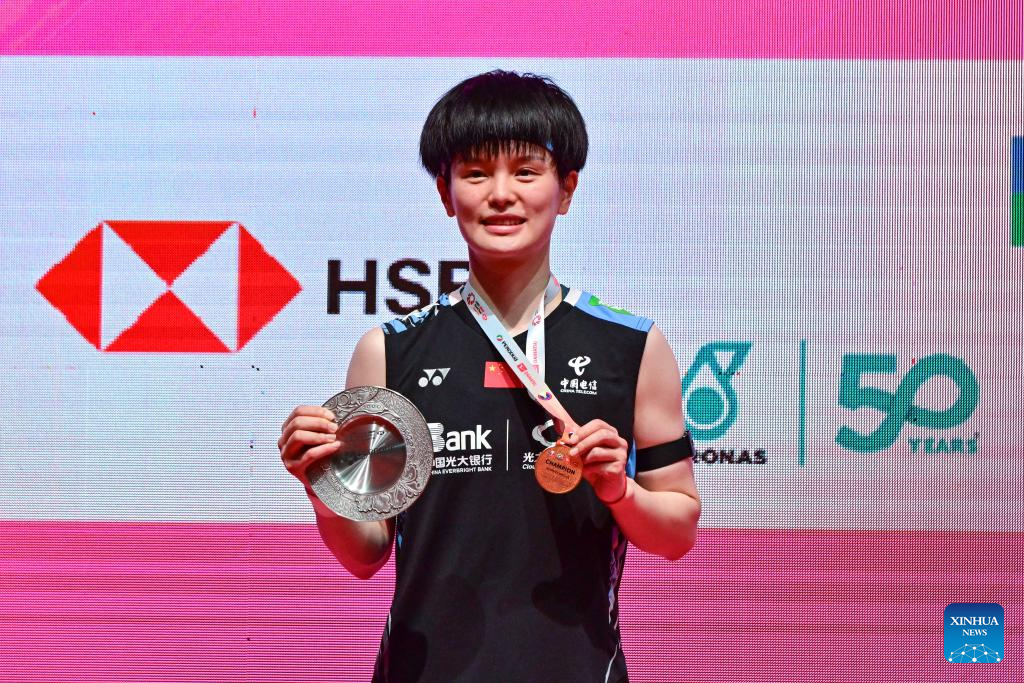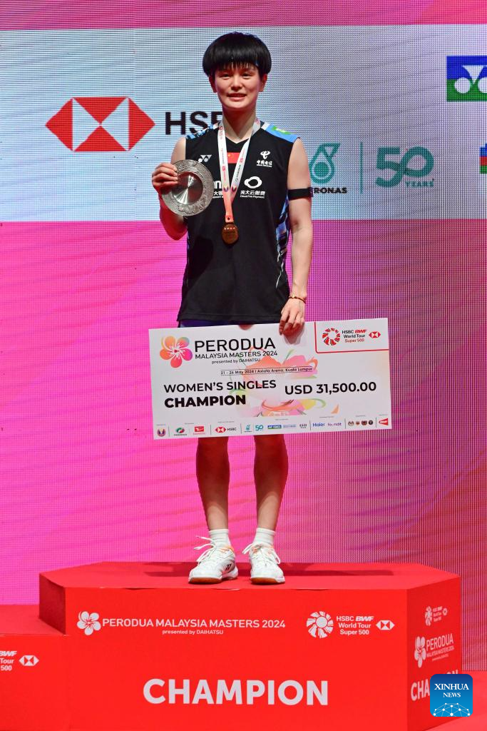 Wang Zhiyi of China poses for photos during the awarding ceremony after the women's singles final match between Wang Zhiyi of China and Venkata Sindhu Pusarla of India at Malaysia Masters 2024 in Kuala Lumpur, Malaysia, May. 26, 2024. (Photo by Chong Voon Chung/Xinhua)