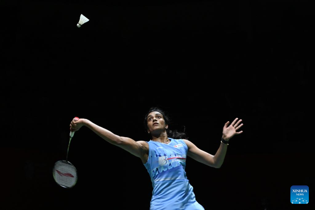 Venkata Sindhu Pusarla of India hits a return during the women's singles final match between Wang Zhiyi of China and Venkata Sindhu Pusarla of India at Malaysia Masters 2024 in Kuala Lumpur, Malaysia, May. 26, 2024. (Photo by Chong Voon Chung/Xinhua)