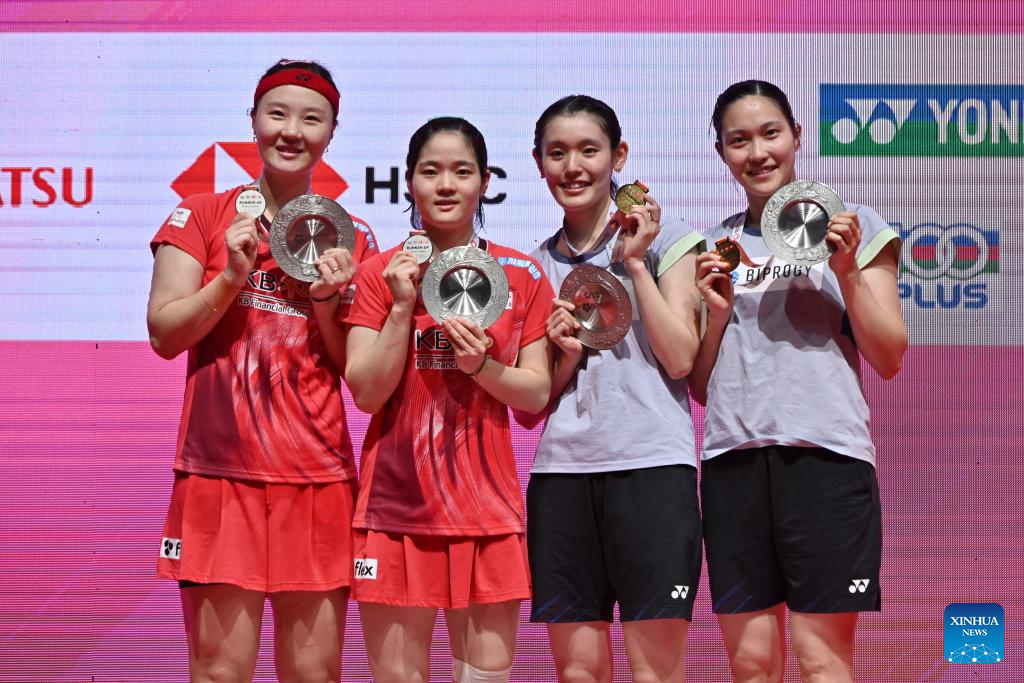 First placed Iwanaga Rin (2nd R)/Nakanishi Kie (1st R) of Japan and second placed Lee Yu Lim (2nd L)/Shin Seung Chan of South Korea pose for photos after the women's doubles final match at Malaysia Masters 2024 in Kuala Lumpur, Malaysia, May 26, 2024. (Photo by Chong Voon Chung/Xinhua)