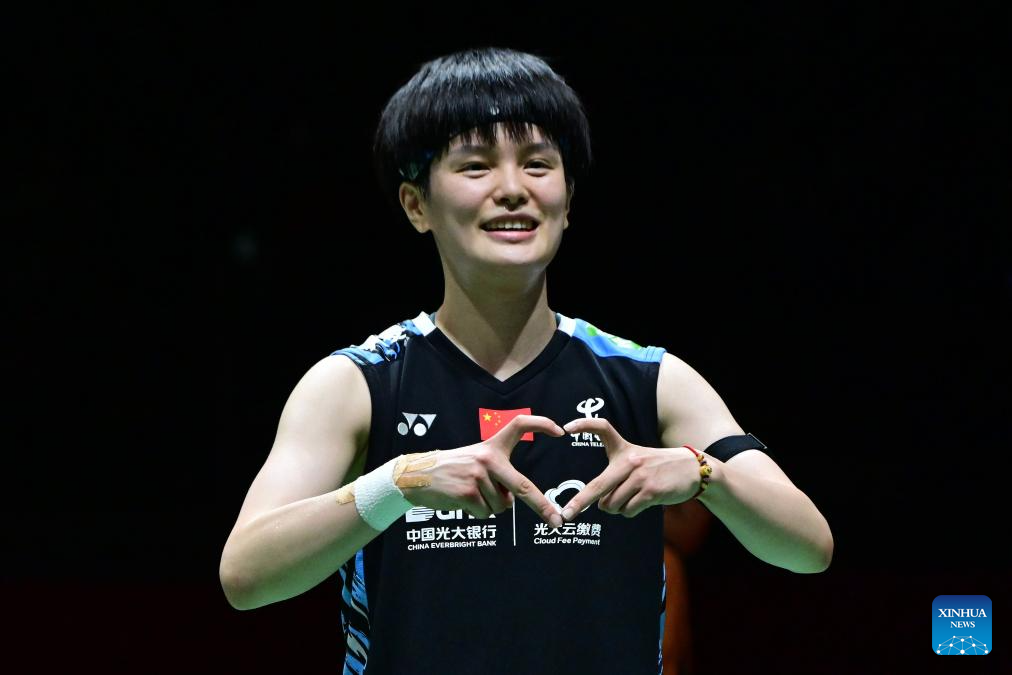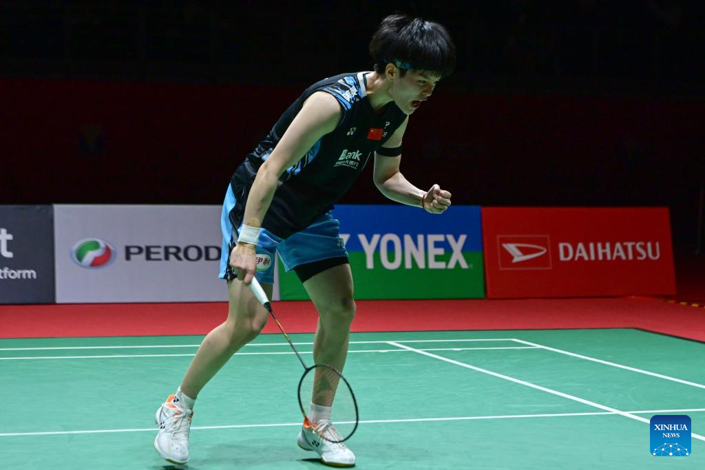 Wang Zhiyi of China celebrates during the women's singles final match between Wang Zhiyi of China and Venkata Sindhu Pusarla of India at Malaysia Masters 2024 in Kuala Lumpur, Malaysia, May. 26, 2024. (Photo by Chong Voon Chung/Xinhua)