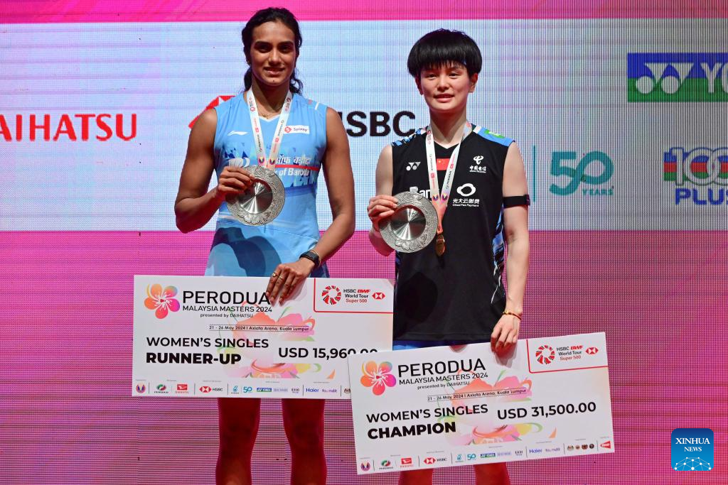 Wang Zhiyi (R) of China and Venkata Sindhu Pusarla of India pose for photos during the awarding ceremony after the women's singles final match between Wang Zhiyi of China and Venkata Sindhu Pusarla of India at Malaysia Masters 2024 in Kuala Lumpur, Malaysia, May. 26, 2024. (Photo by Chong Voon Chung/Xinhua)