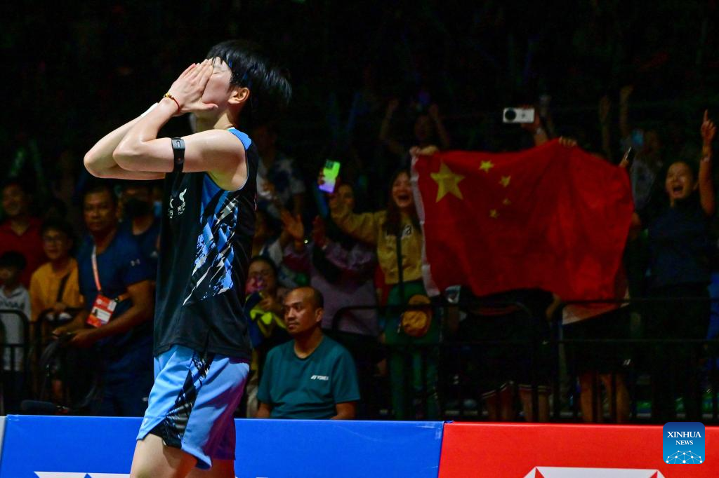 Wang Zhiyi of China celebrates after winning the women's singles final match between Wang Zhiyi of China and Venkata Sindhu Pusarla of India at Malaysia Masters 2024 in Kuala Lumpur, Malaysia, May. 26, 2024. (Photo by Chong Voon Chung/Xinhua)