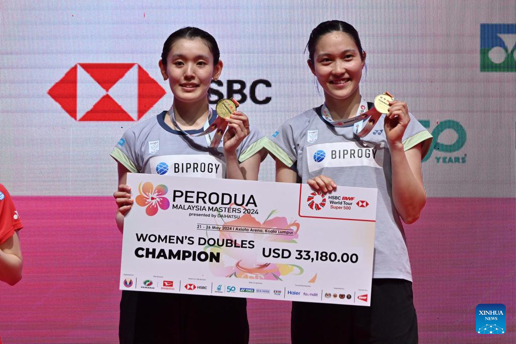 First placed Iwanaga Rin (L)/Nakanishi Kie of Japan pose for photos after the women's doubles final match against Lee Yu Lim/Shin Seung Chan of South Korea at Malaysia Masters 2024 in Kuala Lumpur, Malaysia, May 26, 2024. (Photo by Chong Voon Chung/Xinhua)