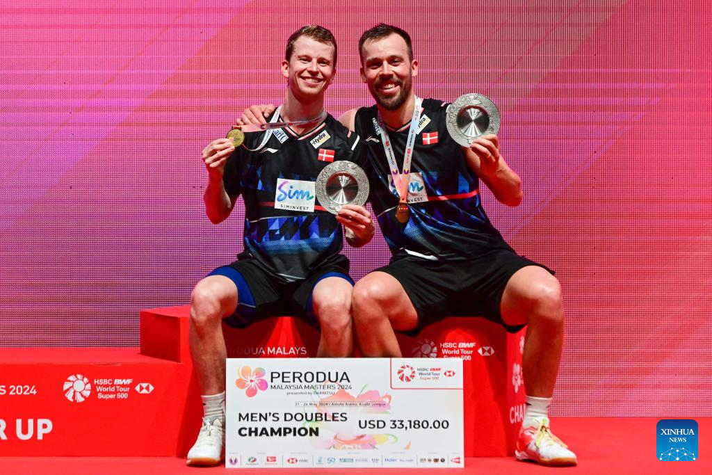 Kim Astrup (L)/Anders Skaarup Rasmusse of Denmark pose for photos during the awarding ceremony for the men's doubles final match between Kim Astrup/Anders Skaarup Rasmussen of Denmark and Jin Yong/Na Sung-seung of South Korea at Malaysia Masters 2024 in Kuala Lumpur, Malaysia, May. 26, 2024. (Photo by Chong Voon Chung/Xinhua)