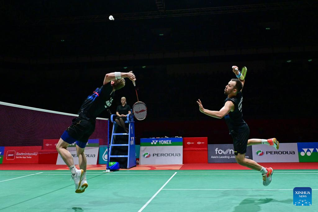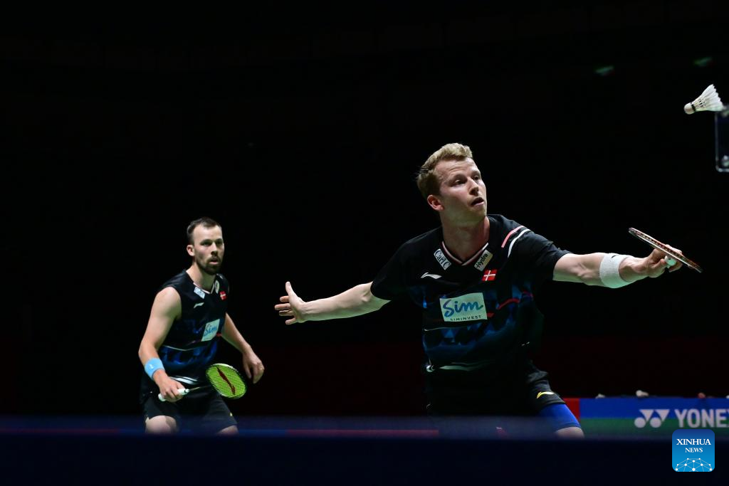 Kim Astrup (R)/Anders Skaarup Rasmussen of Denmark hit a return during the men's doubles final match between Kim Astrup/Anders Skaarup Rasmussen of Denmark and Jin Yong/Na Sung-seung of South Korea at Malaysia Masters 2024 in Kuala Lumpur, Malaysia, May. 26, 2024. (Photo by Chong Voon Chung/Xinhua)