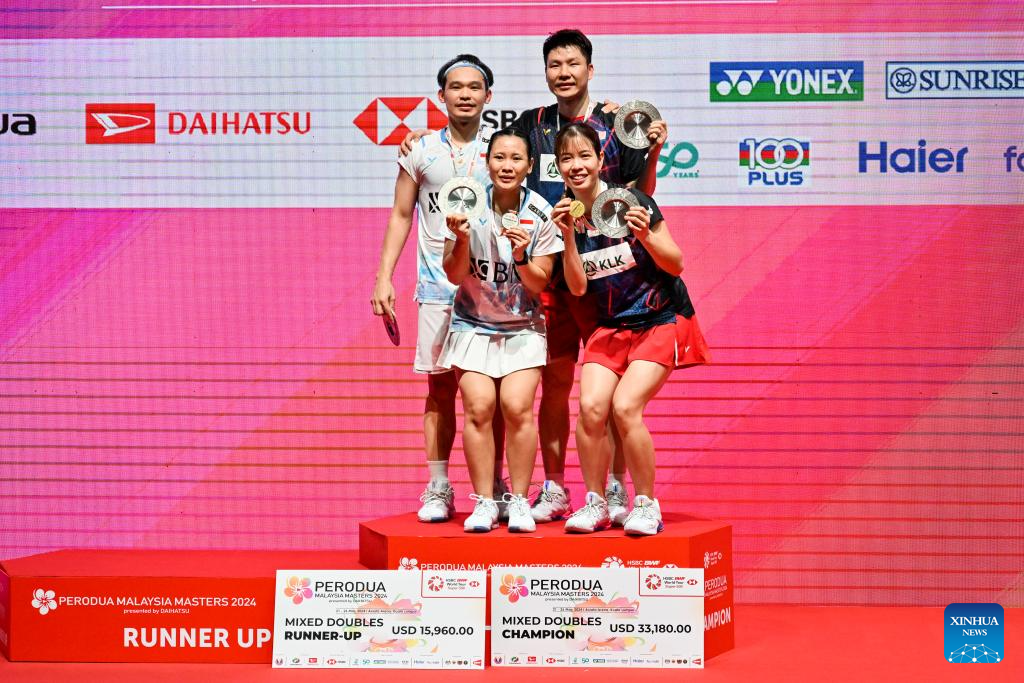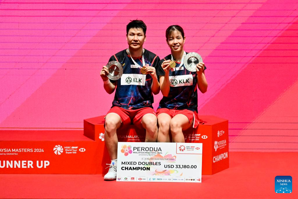 Goh Soon Huat (L)/Lai Shevon Jemie of Malaysia pose for photos during the awarding ceremony after the mixed doubles final match between Goh Soon Huat/Lai Shevon Jemie of Malaysia and Rinov Rivaldy/Pitha Haningtyas Mentari of Indonesia at Malaysia Masters 2024 in Kuala Lumpur, Malaysia, May. 26, 2024. (Xinhua/Cheng Yiheng)