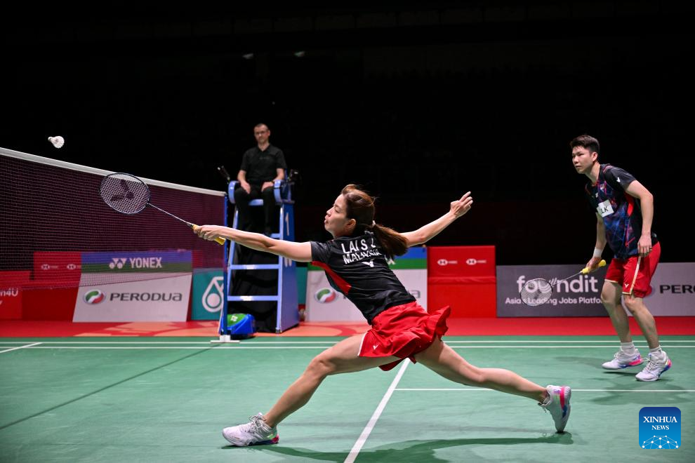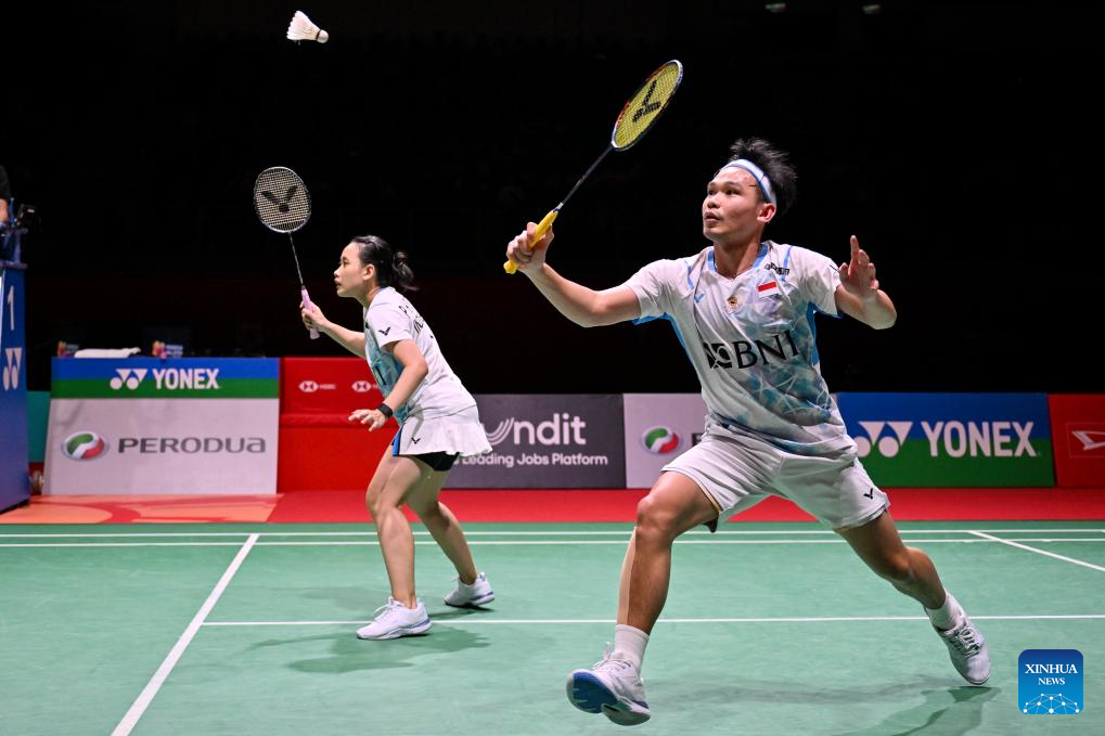 Rinov Rivaldy(R)/Pitha Haningtyas Mentari of Indonesia hit a return during the mixed doubles final match between Goh Soon Huat/Lai Shevon Jemie of Malaysia and Rinov Rivaldy/Pitha Haningtyas Mentari of Indonesia at Malaysia Masters 2024 in Kuala Lumpur, Malaysia, May. 26, 2024. (Xinhua/Cheng Yiheng)