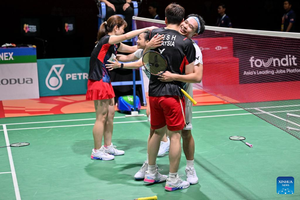 Goh Soon Huat(2nd R)/Lai Shevon Jemie(1st L) of Malaysia greet Rinov Rivaldy(1st R)/Pitha Haningtyas Mentari of Indonesia after the mixed doubles final match between Goh Soon Huat/Lai Shevon Jemie of Malaysia and Rinov Rivaldy/Pitha Haningtyas Mentari of Indonesia at Malaysia Masters 2024 in Kuala Lumpur, Malaysia, May. 26, 2024. (Xinhua/Cheng Yiheng)