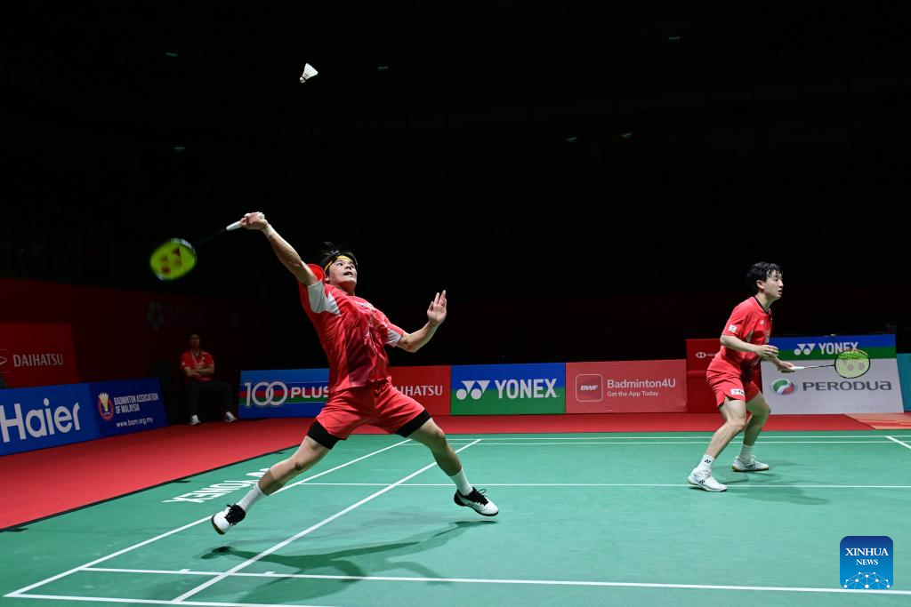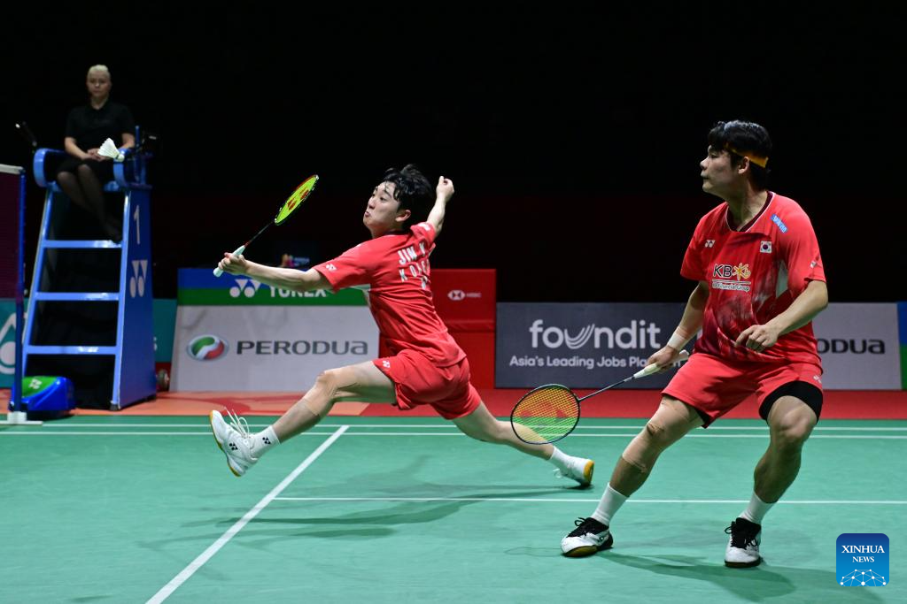 Jin Yong(R)/Na Sung-seung of South Korea hit a return during the men's doubles final match between Kim Astrup/Anders Skaarup Rasmussen of Denmark and Jin Yong/Na Sung-seung of South Korea at Malaysia Masters 2024 in Kuala Lumpur, Malaysia, May. 26, 2024. (Photo by Chong Voon Chung/Xinhua)