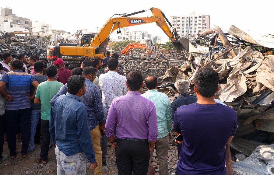 People watch as machines remove burnt debris after a fire broke out in an entertainment park at Rajkot district of India's western state of Gujarat, May 26, 2024. (Str/Xinhua)