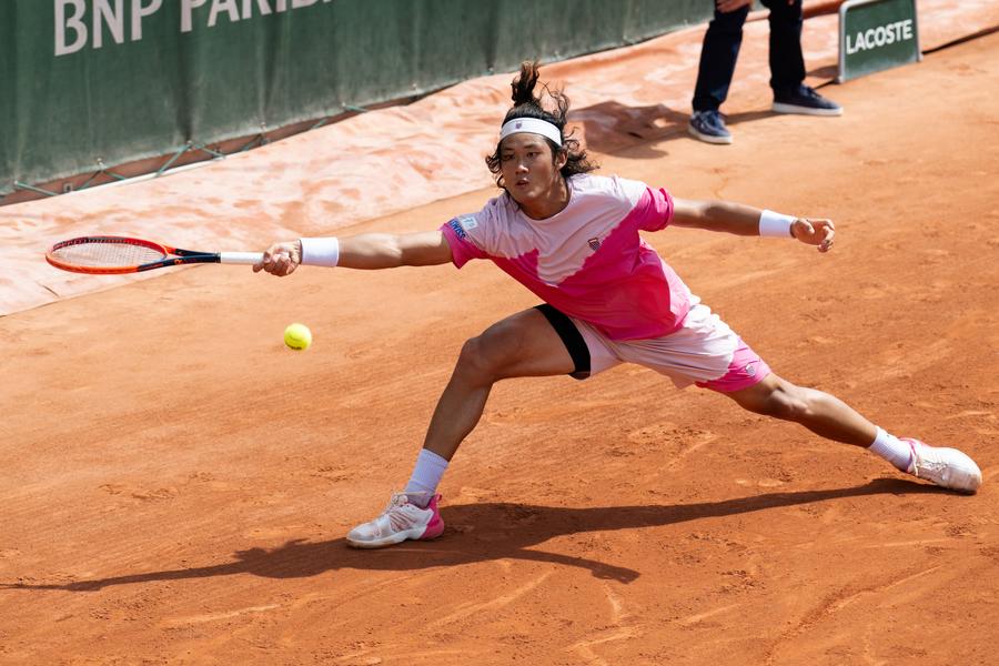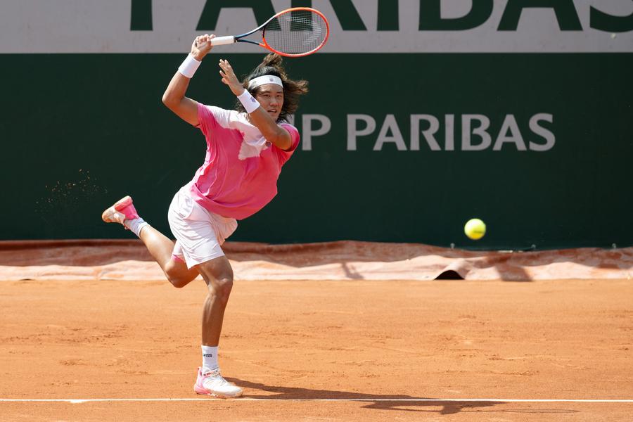 Zhang Zhizhen of China hits a return during the men's singles first round match between Zhang Zhizhen of China and Aleksandar Vukic of Australia at the French Open tennis tournament at Roland Garros, Paris, France, May 26, 2024. (Xinhua/Meng Dingbo)