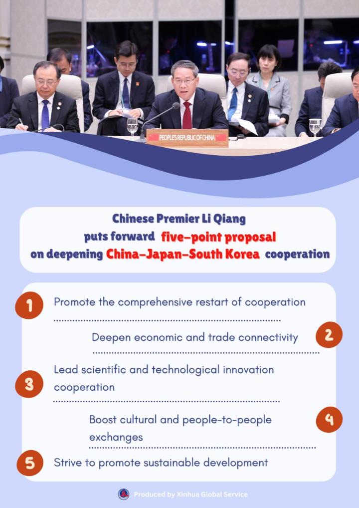 Chinese Premier Li Qiang has put forward a five-point proposal on deepening China-Japan-South Korea cooperation at the ninth Trilateral Summit Meeting among China, Japan and South Korea. Here's what he has proposed.