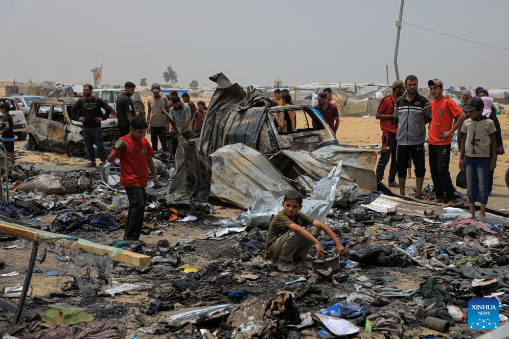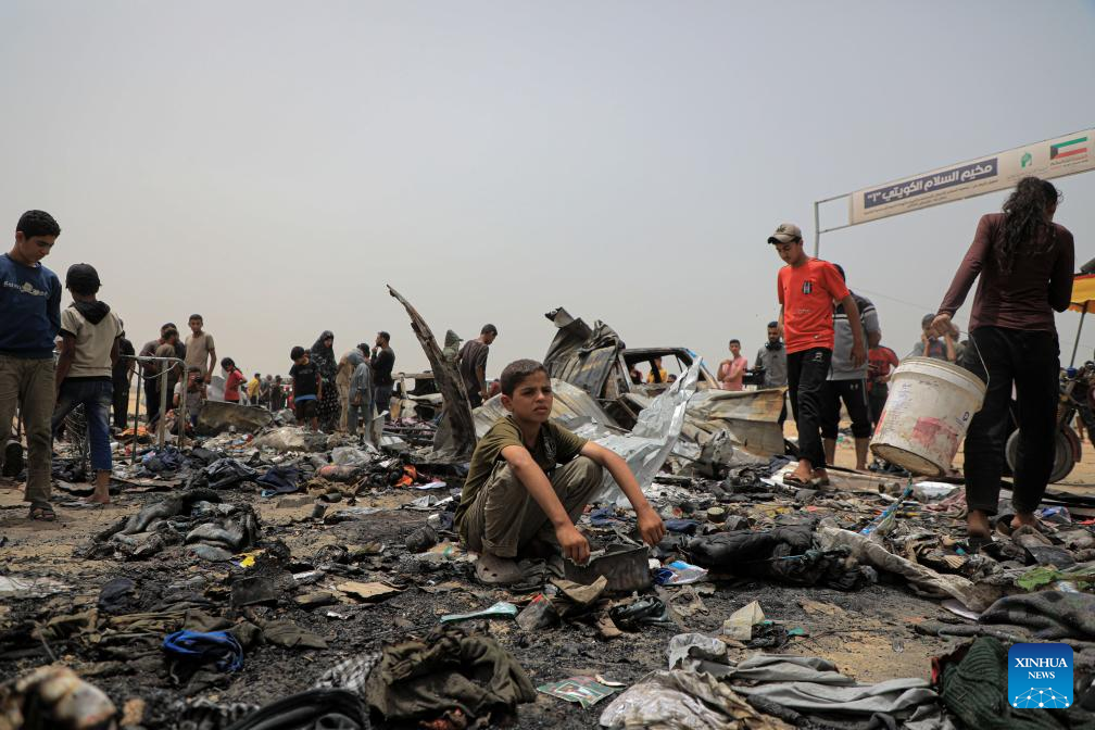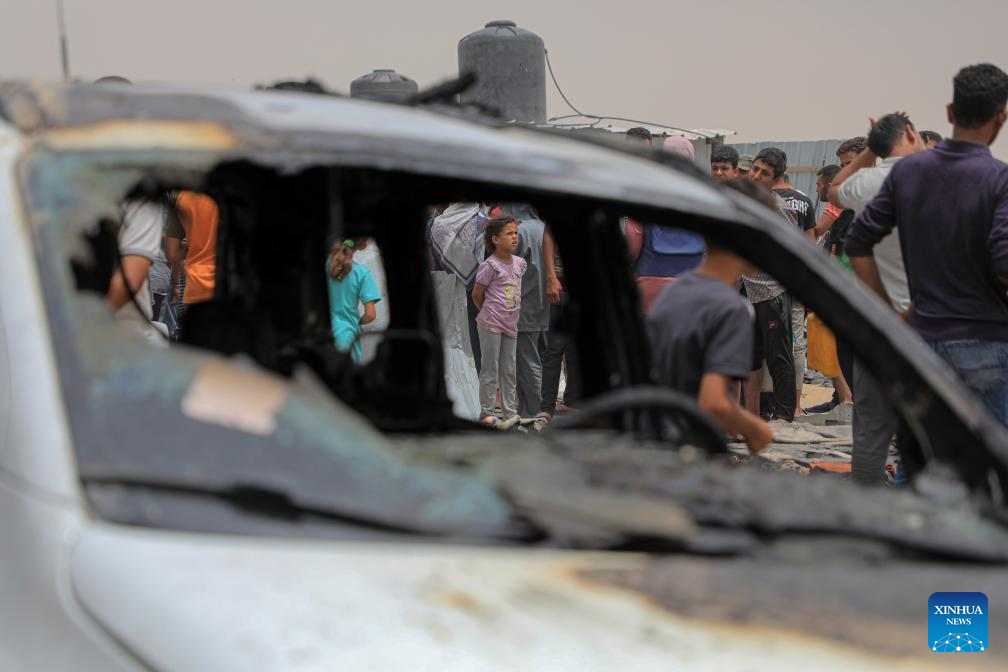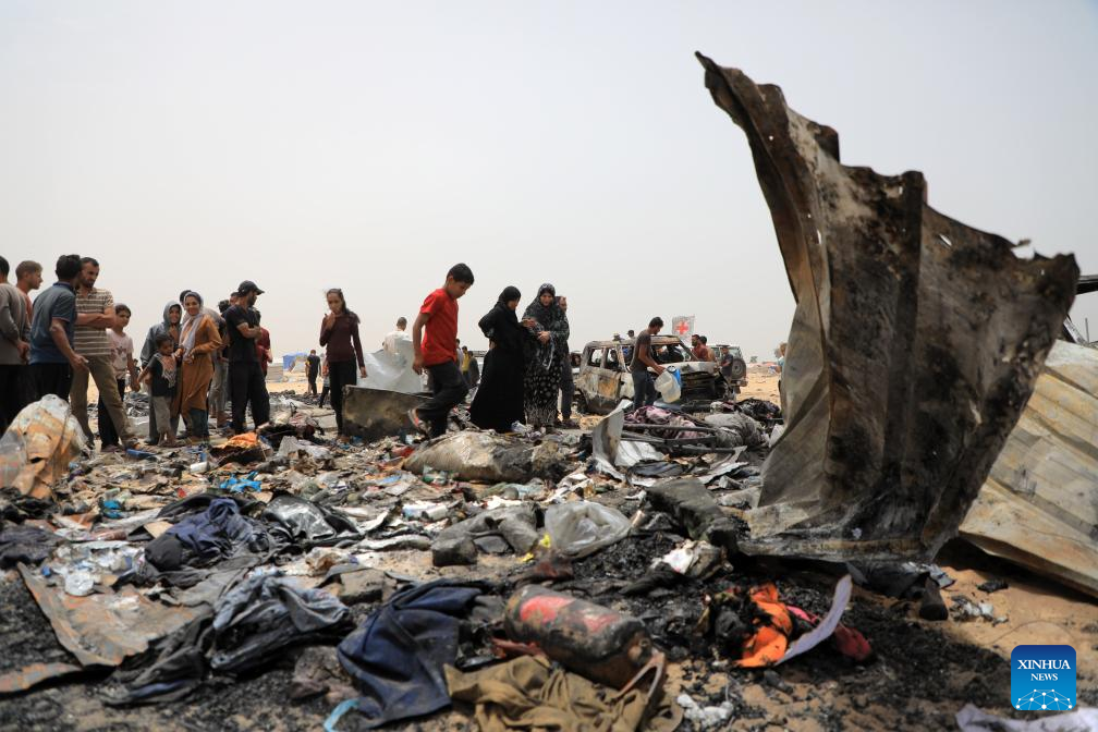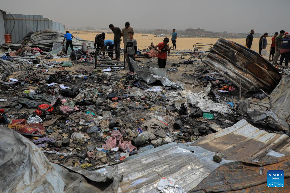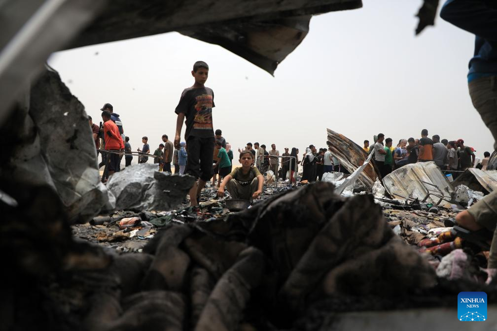 Palestinians are seen at the site of an Israeli airstrike on tents for displaced people near the southern Gaza Strip city of Rafah, on May 27, 2024. At least 45 Palestinians, including children and women, were killed in Israeli airstrikes on tents for displaced people near Rafah city, Gaza's health authorities said in a press statement on Monday. (Photo by Rizek Abdeljawad/Xinhua)