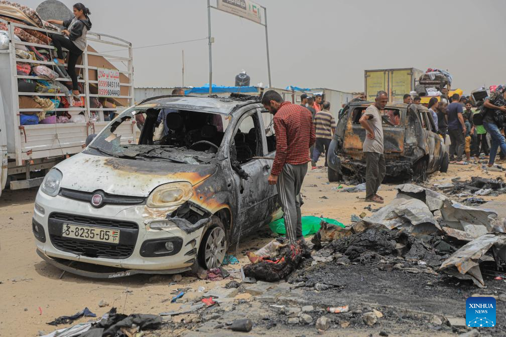 A man looks at a vehicle destroyed in an Israeli airstrike on tents for displaced people near the southern Gaza Strip city of Rafah, on May 27, 2024. At least 45 Palestinians, including children and women, were killed in Israeli airstrikes on tents for displaced people near Rafah city, Gaza's health authorities said in a press statement on Monday. (Photo by Rizek Abdeljawad/Xinhua)