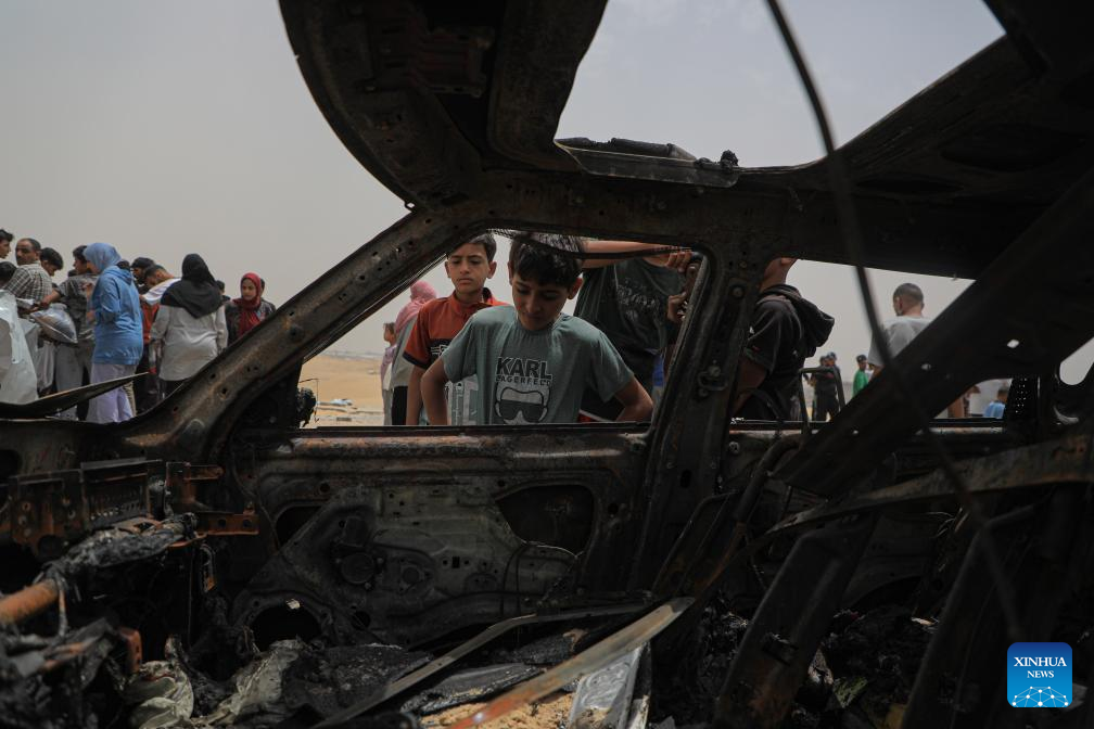 A boy looks at a vehicle destroyed in an Israeli airstrike on tents for displaced people near the southern Gaza Strip city of Rafah, on May 27, 2024. At least 45 Palestinians, including children and women, were killed in Israeli airstrikes on tents for displaced people near Rafah city, Gaza's health authorities said in a press statement on Monday. (Photo by Rizek Abdeljawad/Xinhua)