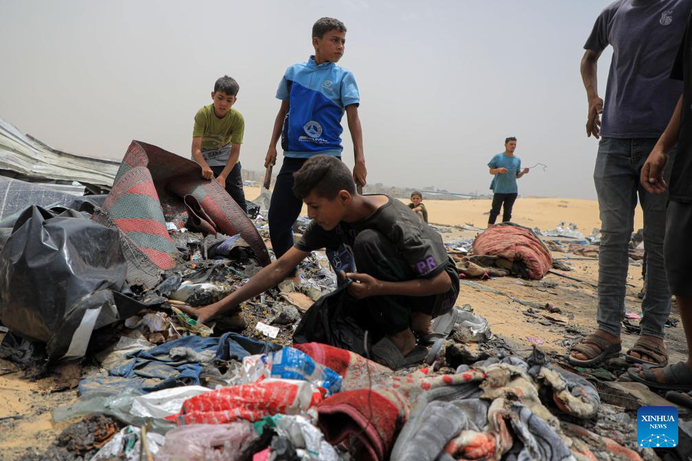 Palestinians collect items after an Israeli airstrike on tents for displaced people near the southern Gaza Strip city of Rafah, on May 27, 2024. At least 45 Palestinians, including children and women, were killed in Israeli airstrikes on tents for displaced people near Rafah city, Gaza's health authorities said in a press statement on Monday. (Photo by Rizek Abdeljawad/Xinhua)