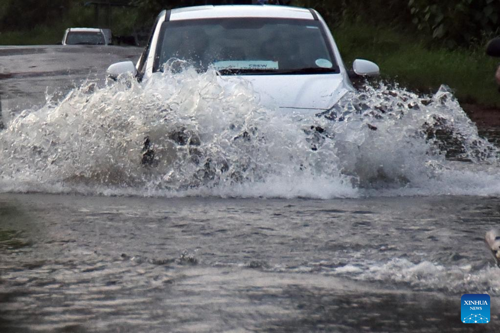 A car plows through a flooded road in Gampaha, Sri Lanka, on May 28, 2024. Sri Lankan President Ranil Wickremesinghe has directed officials to deliver immediate relief to those impacted by the adverse weather conditions as heavy rains and strong winds continued to lash out across the country, said the President's Media Division (PMD) on Tuesday. (Photo by Gayan Sameera/Xinhua)