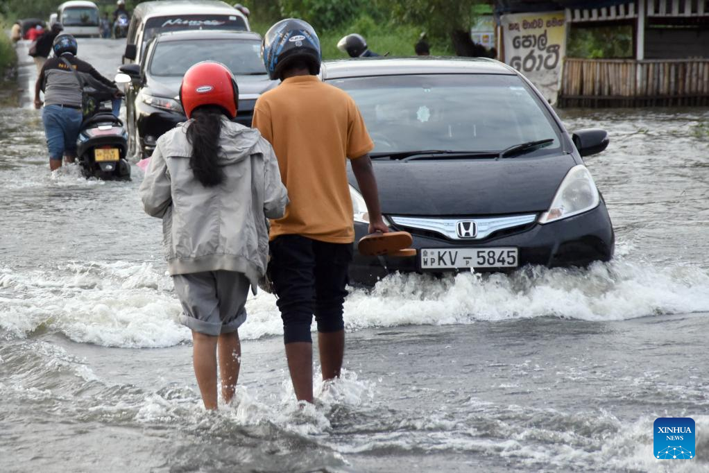 Vehicles and pedestrians are pictured on a flooded road in Gampaha, Sri Lanka, on May 28, 2024. Sri Lankan President Ranil Wickremesinghe has directed officials to deliver immediate relief to those impacted by the adverse weather conditions as heavy rains and strong winds continued to lash out across the country, said the President's Media Division (PMD) on Tuesday. (Photo by Gayan Sameera/Xinhua)