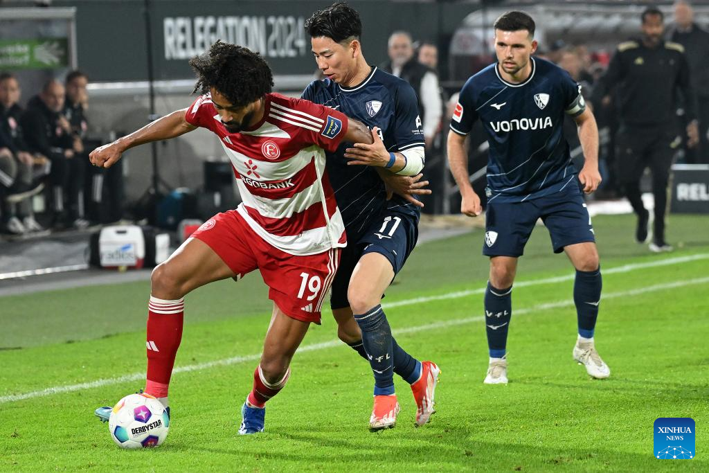 Emmanuel Iyoha (L) of Fortuna Dusseldorf vies with Asano Takuma of VfL Bochum 1848 during the second leg match of Bundesliga relegation/promotion play-off between Fortuna Dusseldorf and VfL Bochum 1848 in Dusseldorf, Germany, May 27, 2024. (Photo by Ulrich Hufnagel/Xinhua)