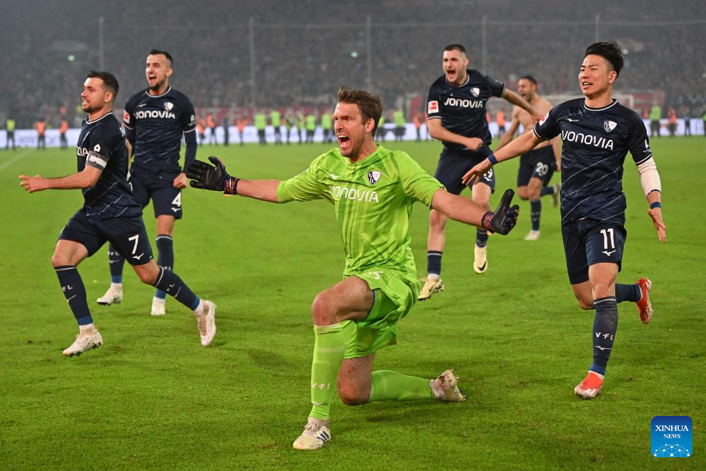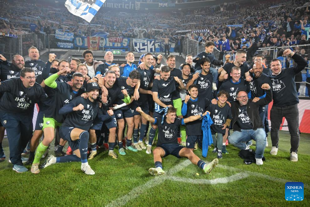 Players of VfL Bochum 1848 celebrate victory after winning the second leg match of Bundesliga relegation/promotion play-off between Fortuna Dusseldorf and VfL Bochum 1848 in Dusseldorf, Germany, May 27, 2024. (Photo by Ulrich Hufnagel/Xinhua)