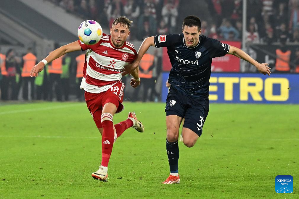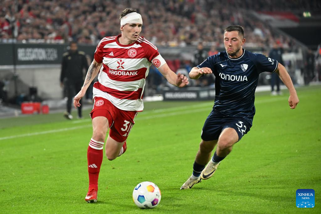 Marcel Sobottka (L) of Fortuna Dusseldorf vies with Maximilian Wittek of VfL Bochum 1848 during the second leg match of Bundesliga relegation/promotion play-off between Fortuna Dusseldorf and VfL Bochum 1848 in Dusseldorf, Germany, May 27, 2024. (Photo by Ulrich Hufnagel/Xinhua)