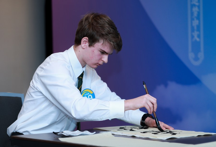 A contestant demonstrates calligraphy in the Australia Final of the 17th "Chinese Bridge" Chinese Proficiency Competition for Foreign Secondary School Students in Sydney, Australia, May 26, 2024. (Xinhua/Ma Ping)