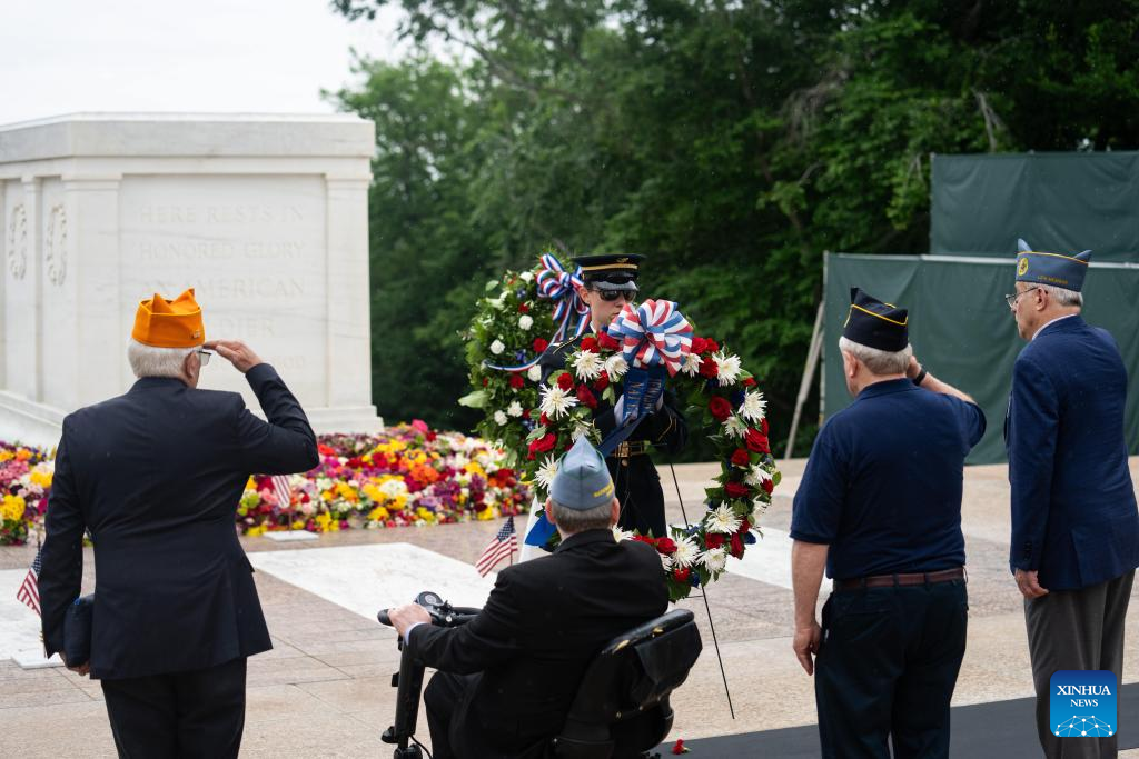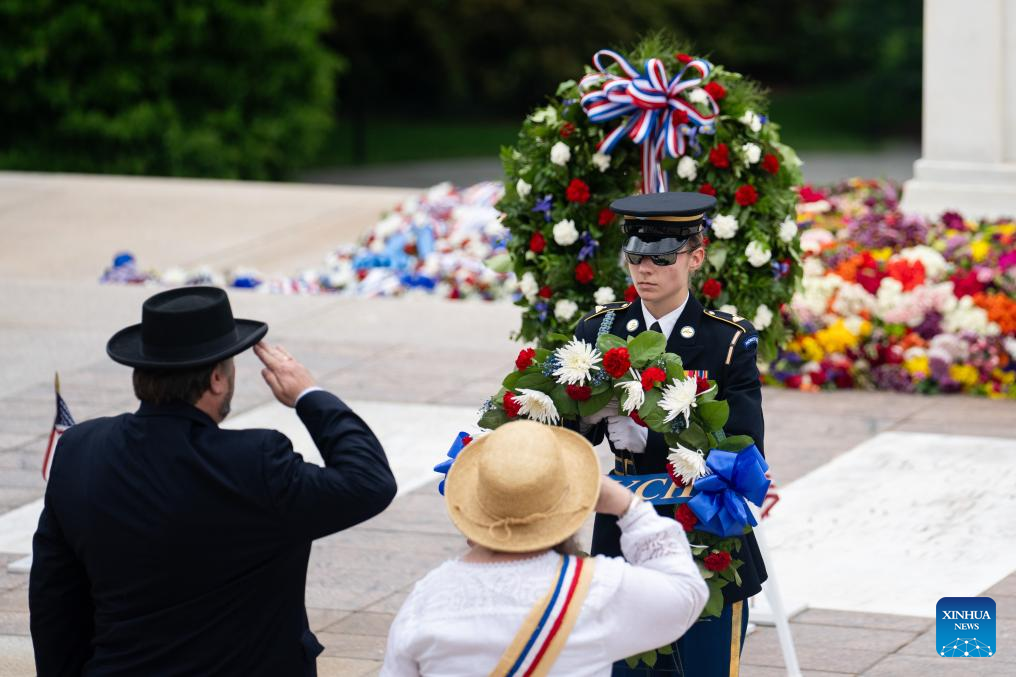 People take part in a wreath-laying ceremony to mark Memorial Day at Arlington Cemetery in Arlington, Virginia, the United States, on May 27, 2024. Memorial Day is a U.S. federal holiday observed on the last Monday of May. (Xinhua/Liu Jie)