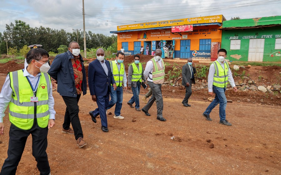 Kenyan President Uhuru Kenyatta (2nd L), accompanied by Transport Cabinet Secretary James Macharia (3rd L) and other officials inspect part of the Kenol-Sagana-Marua road in Nyeri County, Kenya, April 26, 2021. (Photo by Charles Onyango/Xinhua)