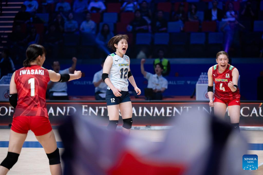 Miyabe Airi (2nd R) of Japan spikes the ball during the match between Brazil and Japan at the Women's Volleyball Nations League 2024 Macao in Macao, south China, May 28, 2024. (Xinhua/Cheong Kam Ka)