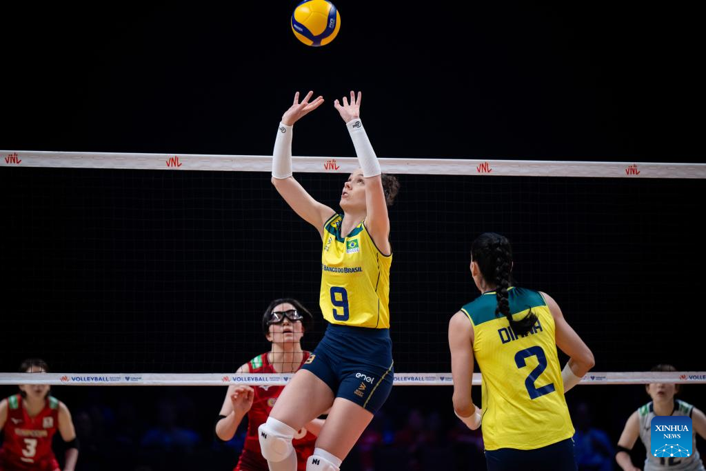 Gabriela Braga Guimaraes (1st R) of Brazil spikes the ball during the match between Brazil and Japan at the Women's Volleyball Nations League 2024 Macao in Macao, south China, May 28, 2024. (Xinhua/Cheong Kam Ka)