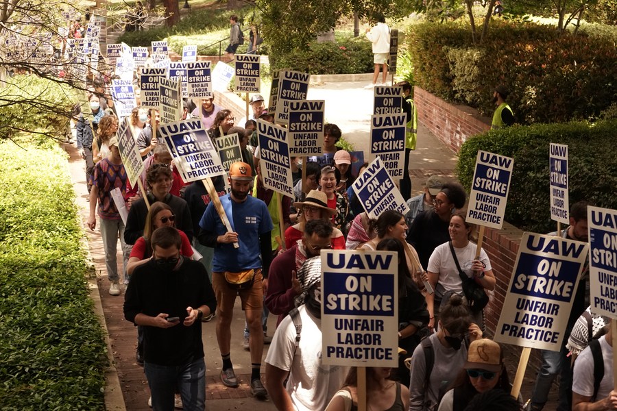LOS ANGELES, May 28 (Xinhua) -- Academic workers at the University of California (UC), Los Angeles, in the U.S. state of California, walked off the job on Tuesday to protest the public university system's handling of pro-Palestinian protests.