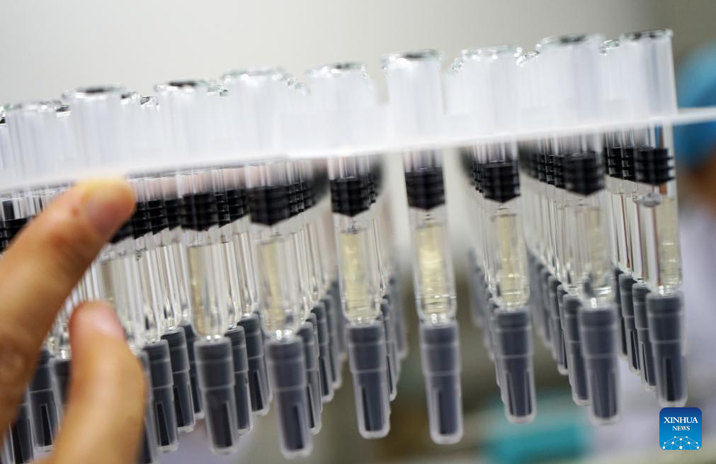 This undated file photo shows a staff member preparing to check pre-filled syringes at Liaoning Chengda Co., Ltd. in Shenyang, northeast China's Liaoning Province. In recent years, Shenyang has created an environment to better develop biomedicine and medical equipment industries, laying a foundation to form medical industrial clusters.