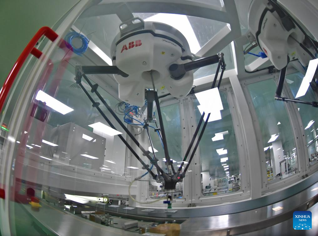 A robot works at a workshop of Shenyang Sinqi Pharmaceutical Co., Ltd. in Shenyang, northeast China's Liaoning Province, May 22, 2024. In recent years, Shenyang has created an environment to better develop biomedicine and medical equipment industries, laying a foundation to form medical industrial clusters.