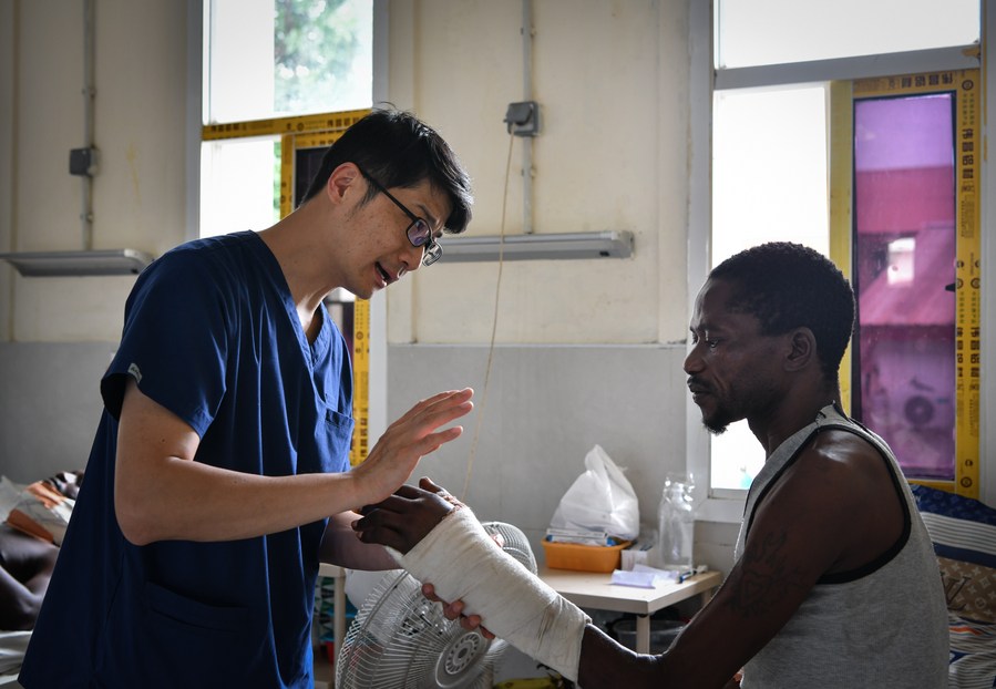 Fang Ming (L), an orthopedist of the Chinese medical team, talks with a patient at Malabo Regional Hospital in Malabo, Equatorial Guinea, on May 16, 2024. (Xinhua/Han Xu)