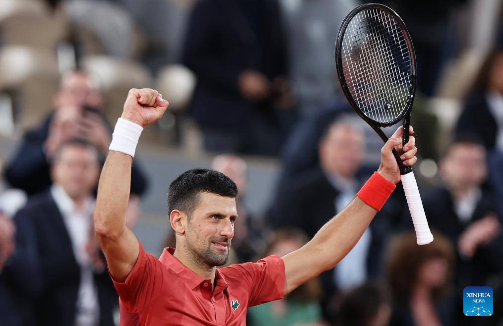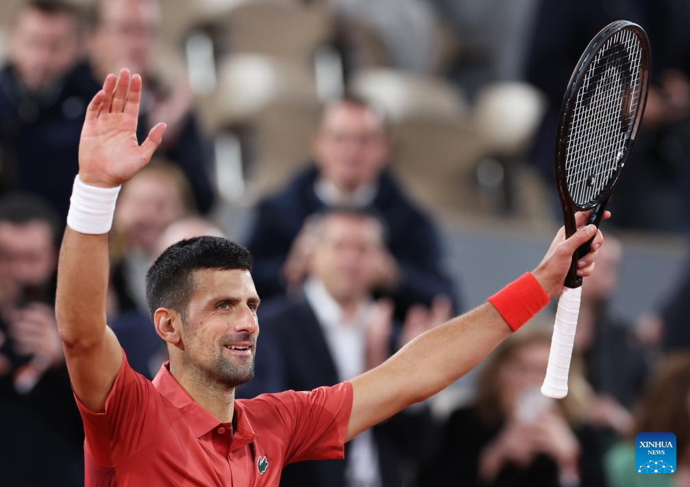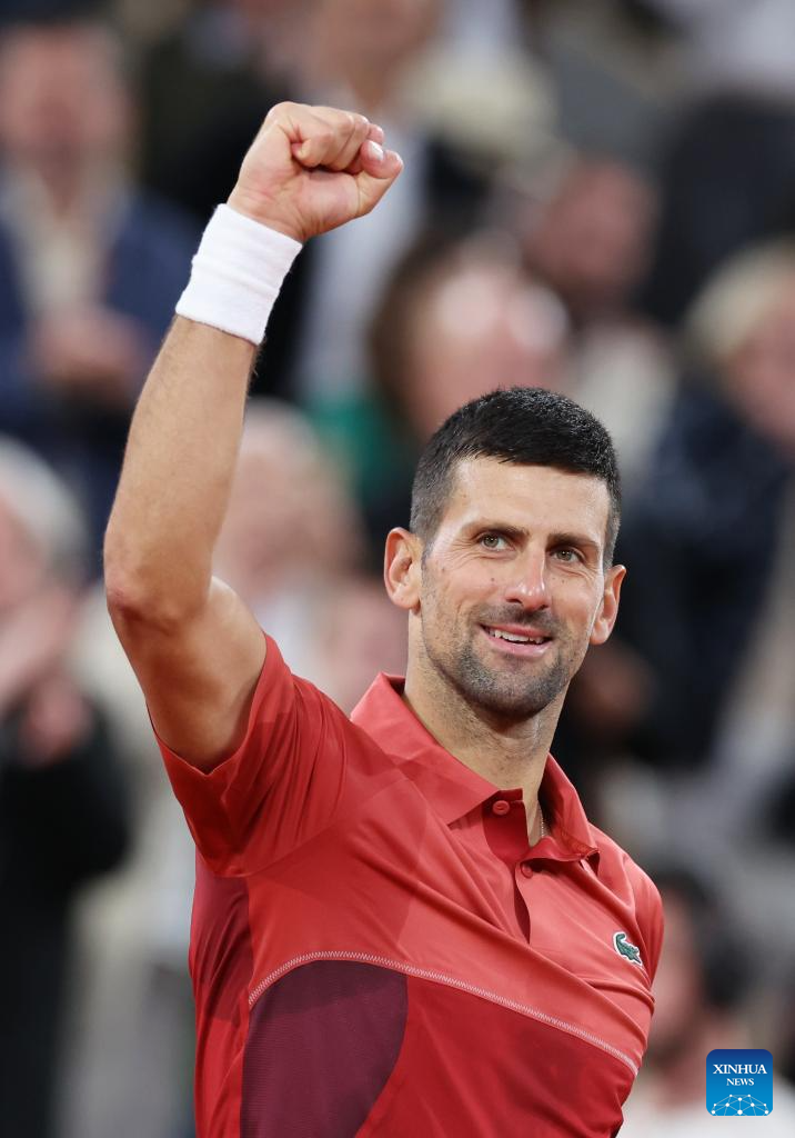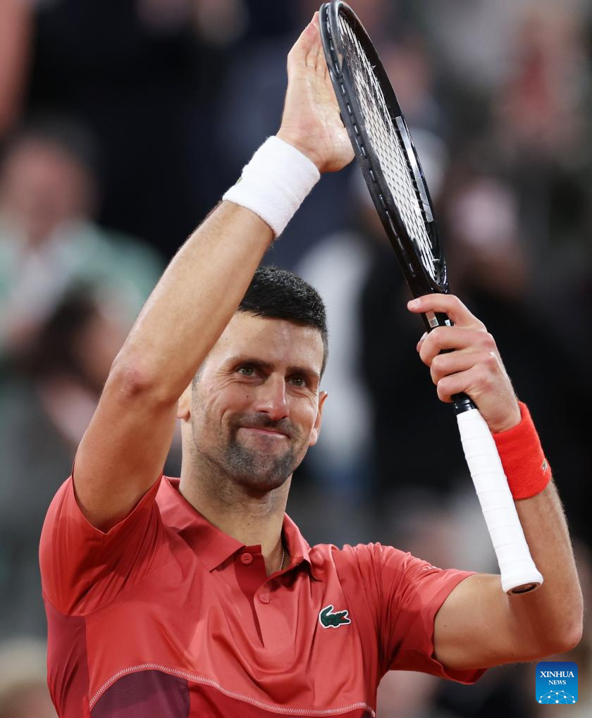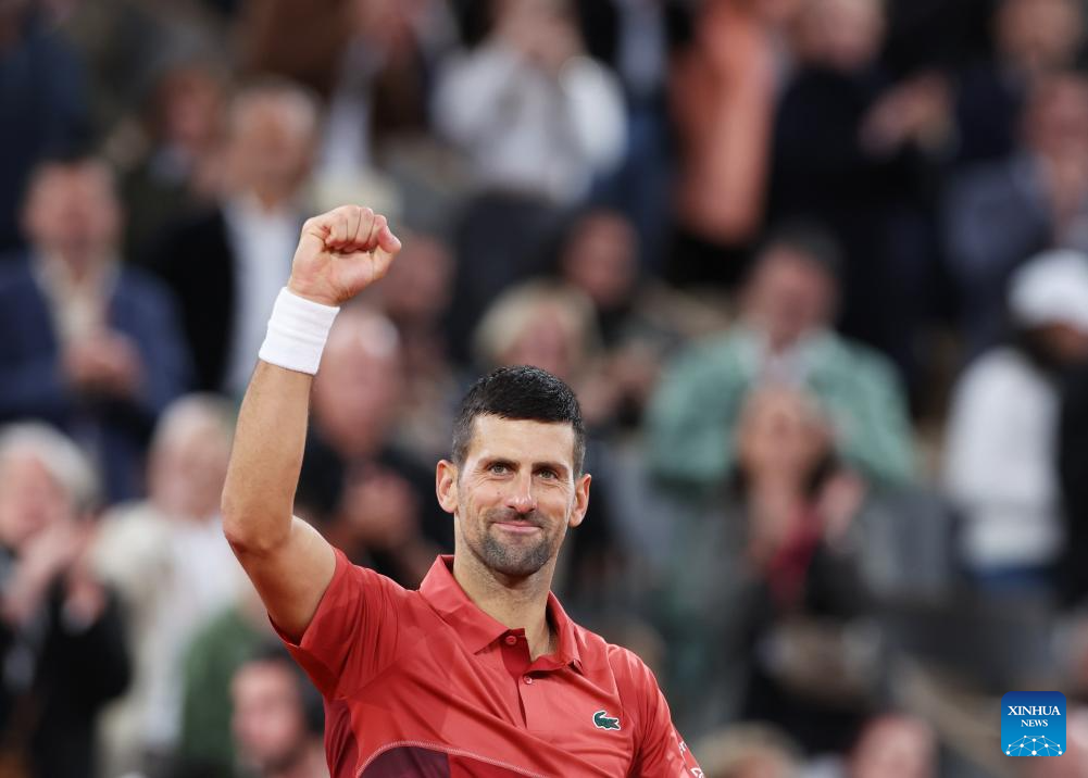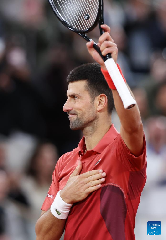 Novak Djokovic of Serbia reacts after the men's singles second round match between Novak Djokovic of Serbia and Roberto Carballes Baena of Spain at the French tennis tournament at Roland Garros in Paris, France, on May 30, 2024. (Xinhua/Gao Jing)
